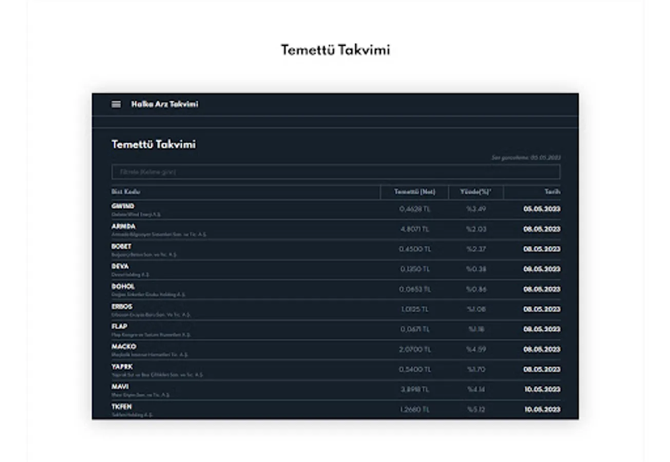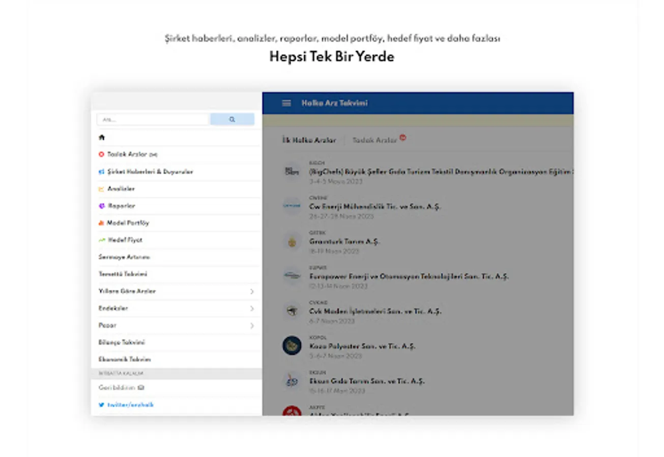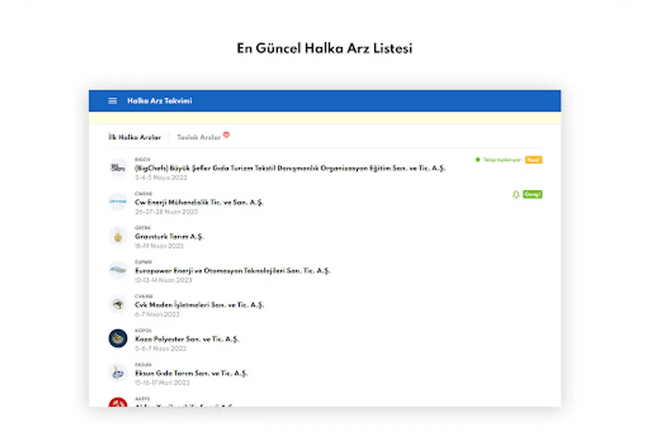 Initial public offering announcements of companies, capital increase, dividend calendar, balance sheet dates and more in this application. Let's explore now!