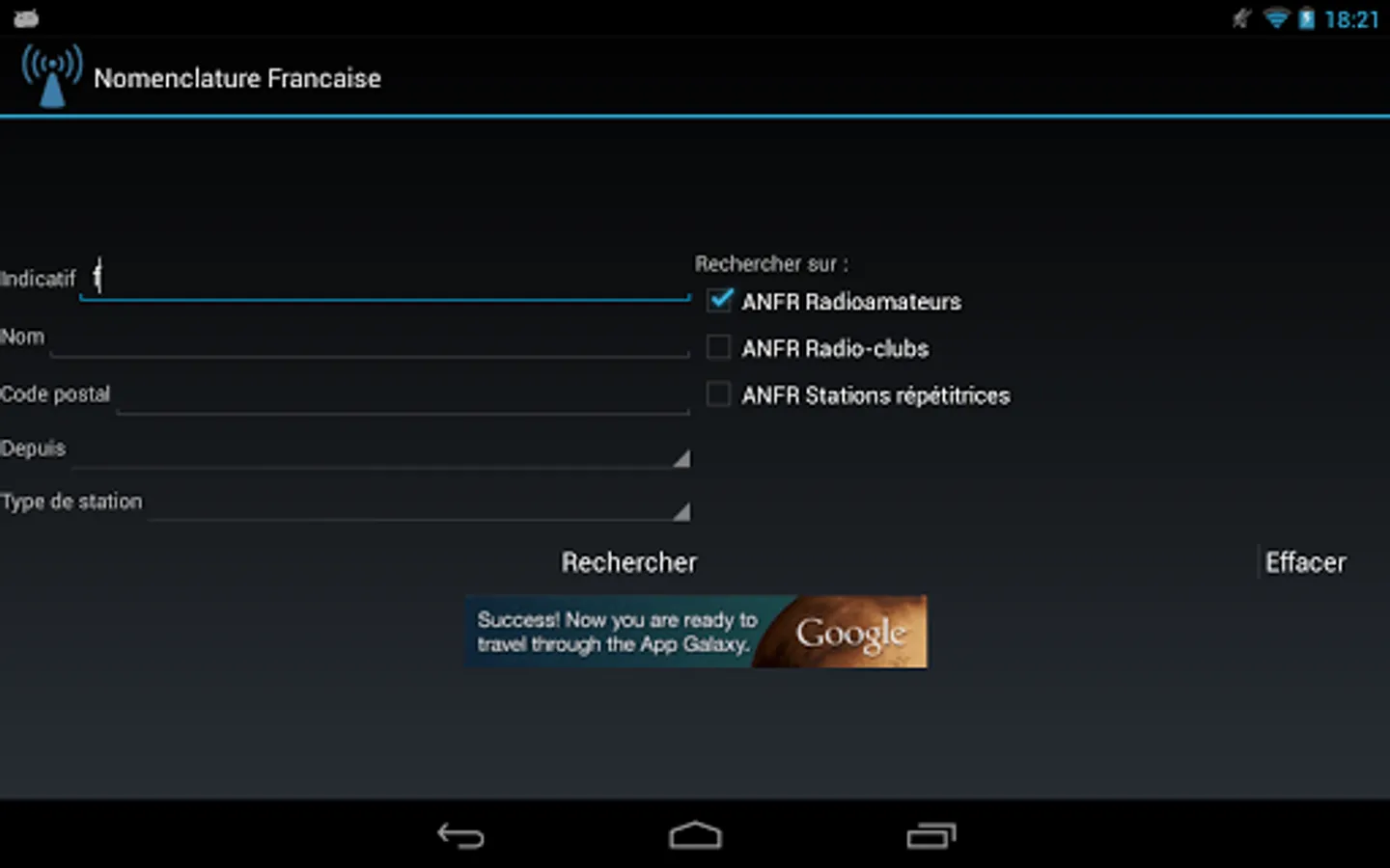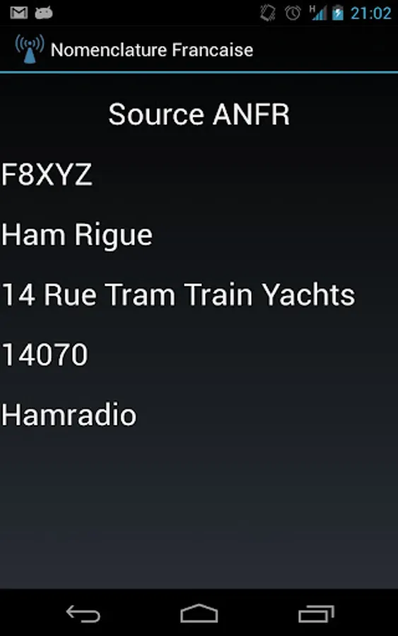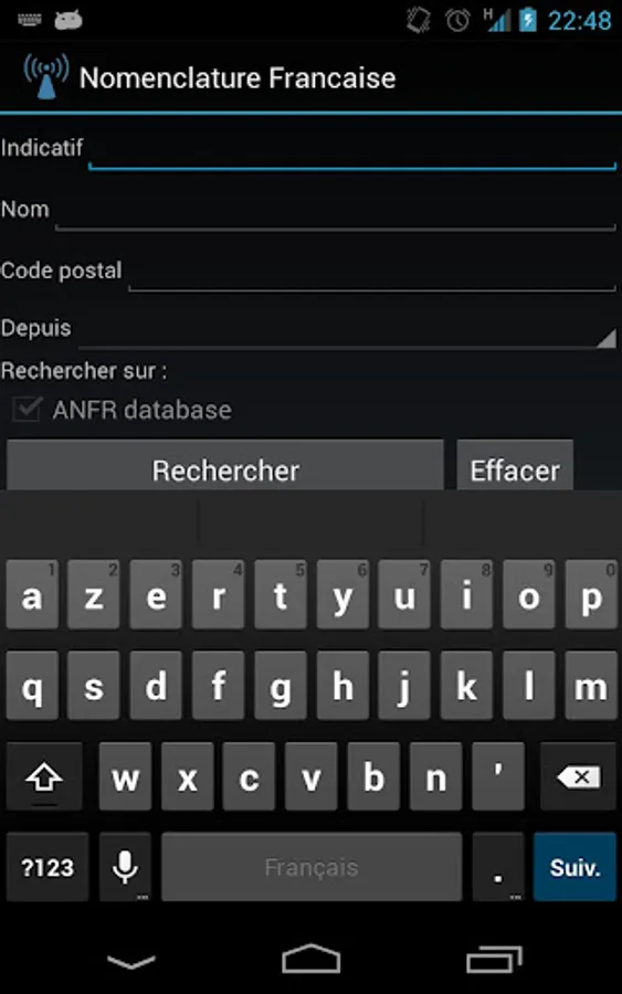 This application allows you to lookup in the French hamradio database provided by the National Frequencies Agency (ANFR).