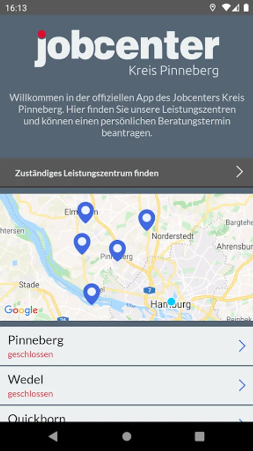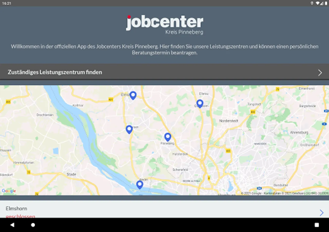 Welcome to the official app of the job center Pinneberg. Here you will find our service centers and can apply for a personal appointment.