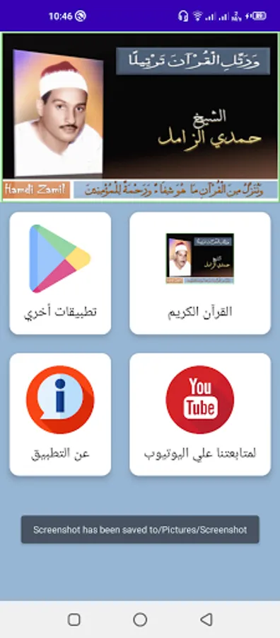 The application contains anecdotes of recitations in the voice of Sheikh Hamdi Al-Zamil.