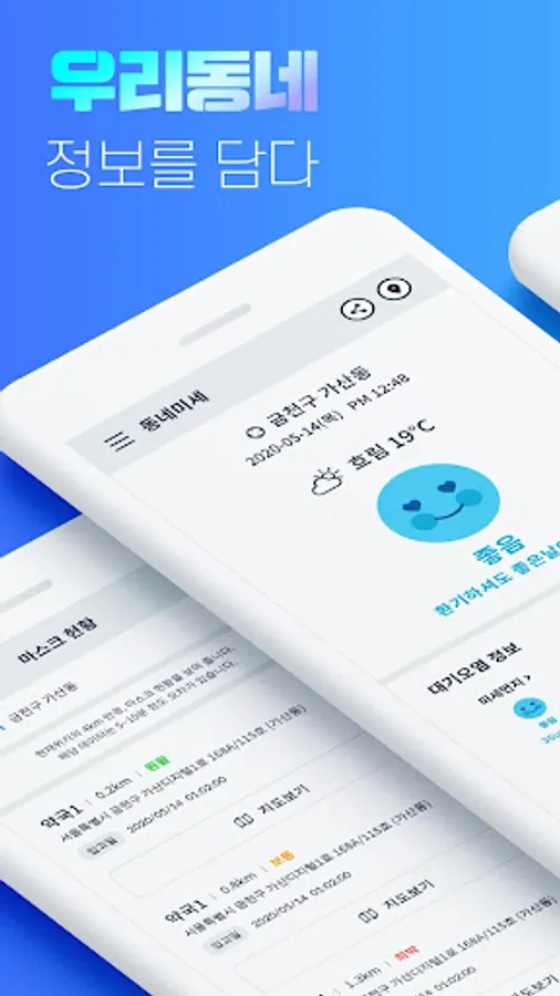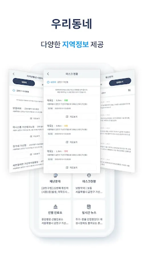 우리동네 현재날씨 부터 코로나19 상황, 이동동선, 지역상품권 사용처, 재난문자, 마스크 현황 까지 꼭 필요정보를 담았습니다.