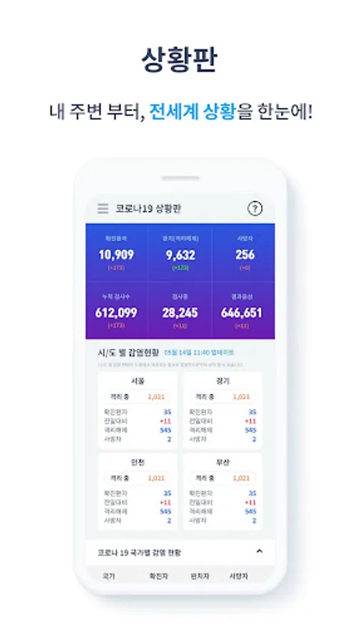 나의 현재 위치의 확진자의 이동동선, 코로나19 상황판 정보를 실시간으로 볼 수 있습니다.