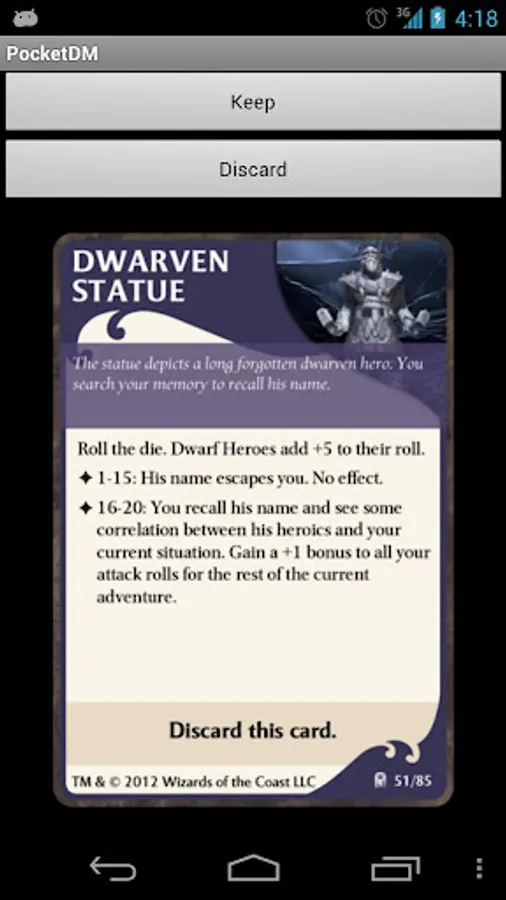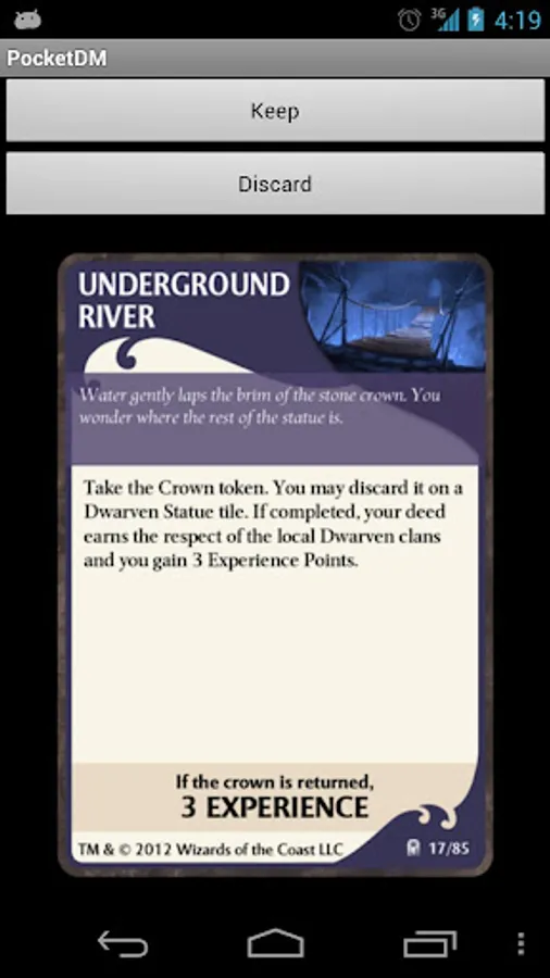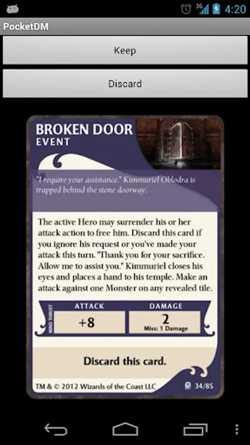 PocketDM is a companion for the D&D Adventure Games 'The Legend of Drizzt', 'Wrath of Ashardalon', and 'Castle Ravenloft'. The application gives the user extra events based on the named tiles they enter as well as new monsters, the ability to keep track of treasure tokens, the option to spawn different amounts of monsters based on customizable values, and much more!
