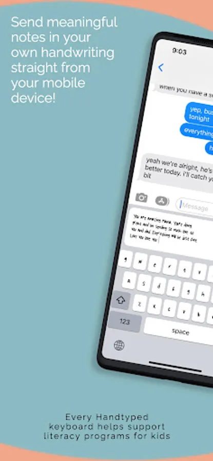 Your custom keyboard will be available in addition to your default keyboard. Once you allow access to the Handtyped app, you will be able to toggle to your custom keyboard and send notes in your own handwriting.