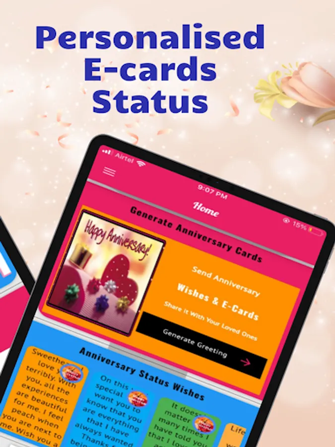 Express your love and personal touch with our personalized e-cards. Customize stunning anniversary-themed designs with your own heartfelt messages and images, creating a truly unique and memorable greeting for your loved ones. Our app ensures that every anniversary wish is personal and crafted with utmost care.