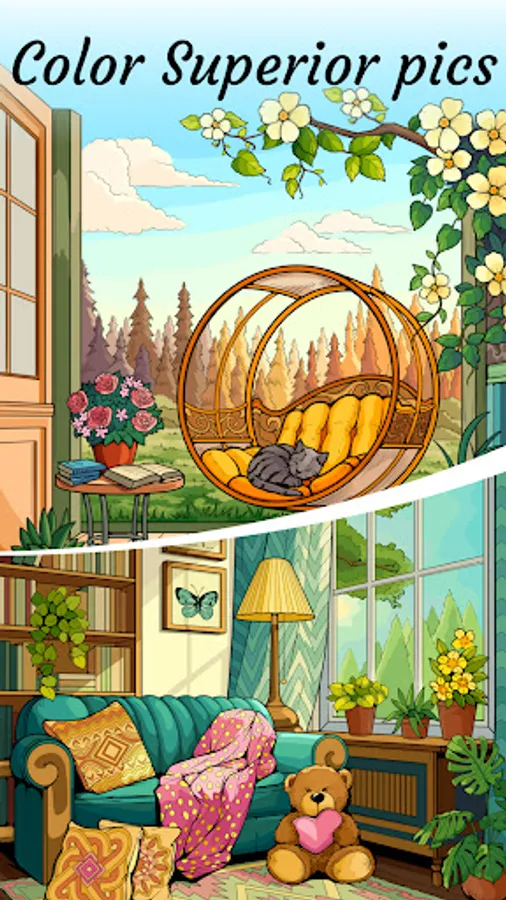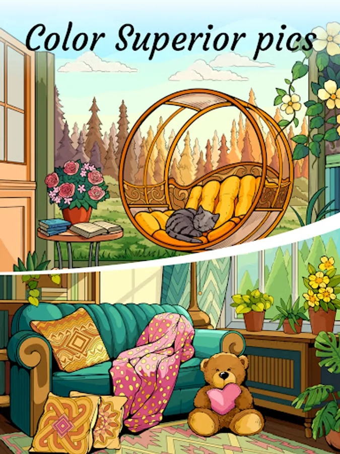 * Discover paintings of natural landscapes, animals, cozy lifestyles, your favorite pets, and more in Zen Color.