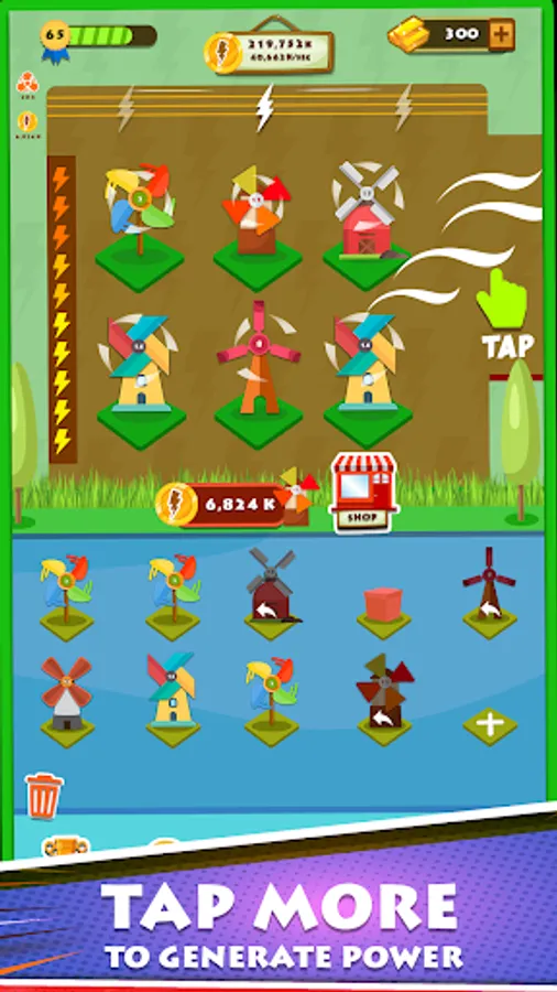 Make maximum profit with different business strategies of BUYING, MERGING, DRAGGING, SWAPPING and TAPPING on windmills to generate maximum power per second and earn more coins and be the richest idle businessman in the world.