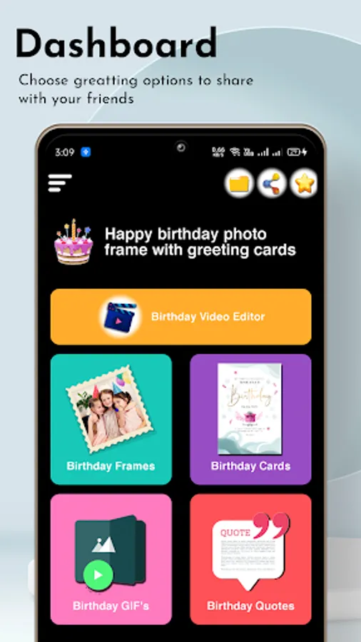 • You can share wishes for birthday with the help beautiful picture frames, greetings cards, GIFs, quotes, images of birthdays, and more
