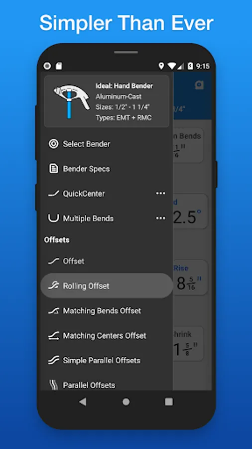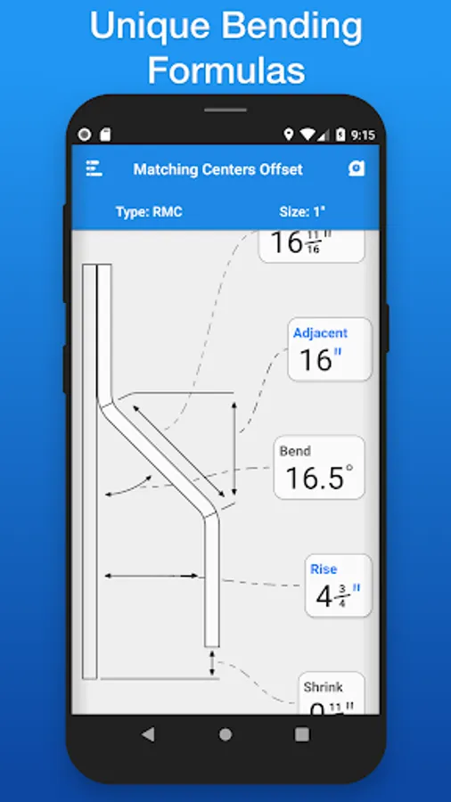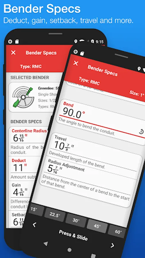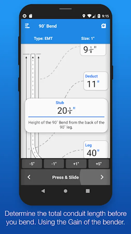 Easily select between different types of benders and choose the size of the shoe and conduit type that you're using. The last bender that you selected will be the bender that appears when you open the app up again. See and edit your bender's information (Centerline Radius, Deduct, Gain, Setback, Travel, and Radius Adjustment) within the 'Bender Specs' section.