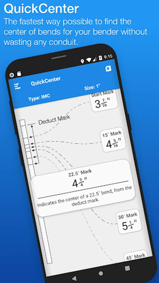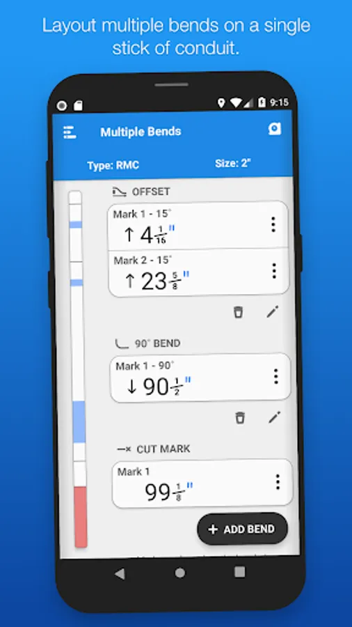 QuickBend is an advanced conduit bending calculator that was created to be fast and accurate while being visually appealing, innovative, and intuitive. Offering you the most accurate measurements using the centerline radius algorithm based upon the bender that you're using.