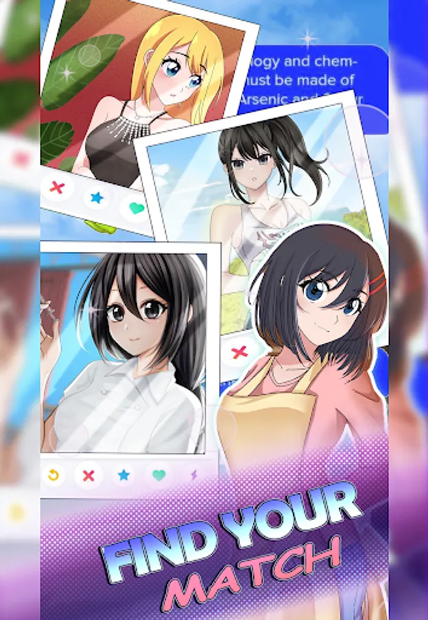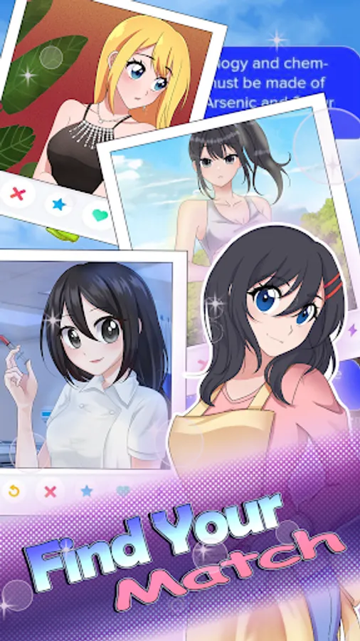 Each waifu girl you match plays out like a mix of visual novel, anime dating games and puzzle games. Chat via direct messages, get to meet the waifu girls and once it’s time for a cool pick-up line or a hot topic question, you get to choose the next message you send and see their reactions, just solve the anime dating games and watch.