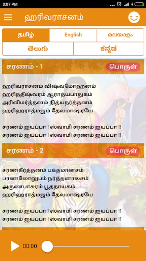 The app consists of the audio song of Harivarasanam along with Tamil, Malayalam, Telugu, Kannada and English lyrics.