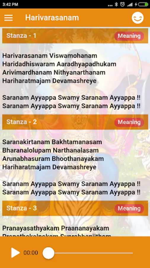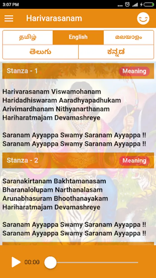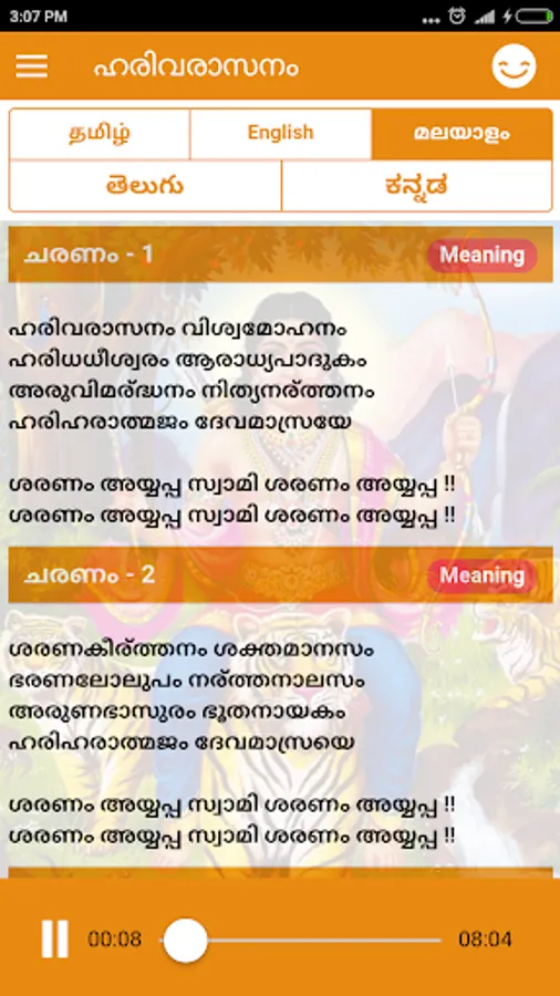 4) Meaning is available for all eight stanzas of Harivarasanam (ஹரிவராசனம், ഹരിവരാസനം, హరివరాసనం, ಹರಿವರಾಸನಂ) in Tamil and English.