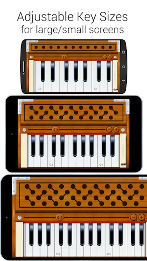 Zoom In / Zoom Out Keys - Use the Plus / Minus buttons for Zoom In / Zoom Out the keys of the harmonium and adjust them according to your needs.
