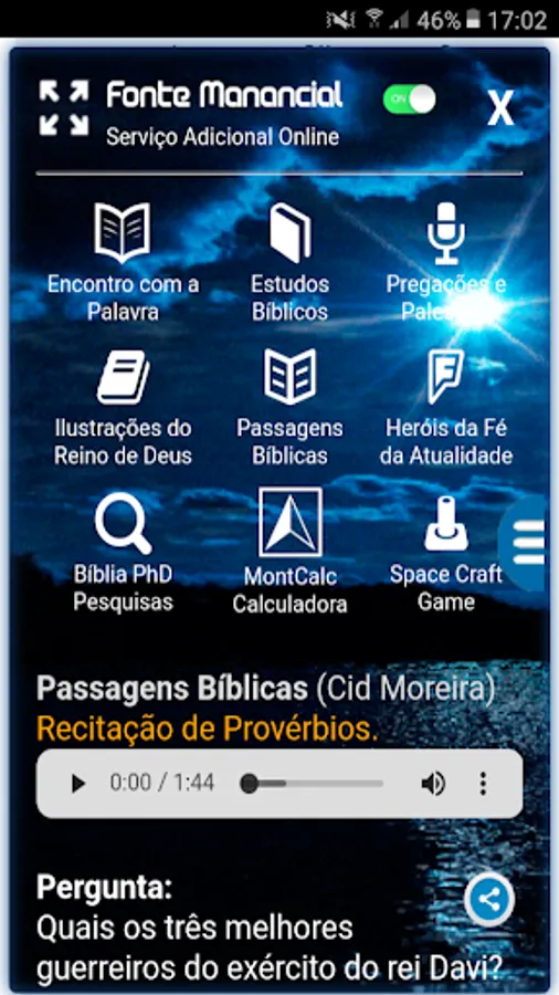 This application also has the additional online service Fonte Manancial with illustrations, audio studies, verses, tips and trivia. When starting the app, being online, the service access button will appear at the bottom with hundreds of studies and audio sermons for your construction.