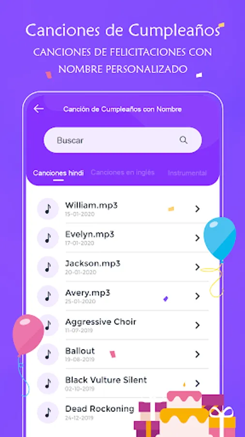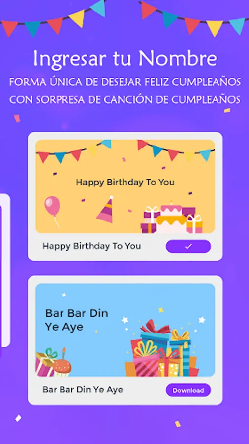 Obtén una canción de cumpleaños en tres categorías.Como Canciones de Cumpleaños en Hindi, Canciones de Cumpleaños en Inglés y Canciones de Cumpleaños Instrumentales, y