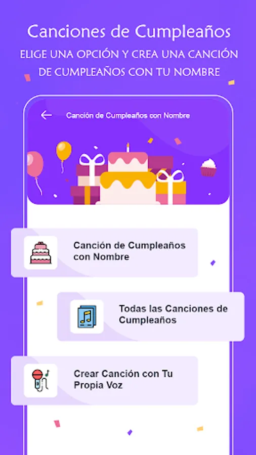 funcionalidad de crear una canción de cumpleaños con un nombre. Solo ingresa tu nombre y la aplicación creará una canción de cumpleaños con tu nombre.