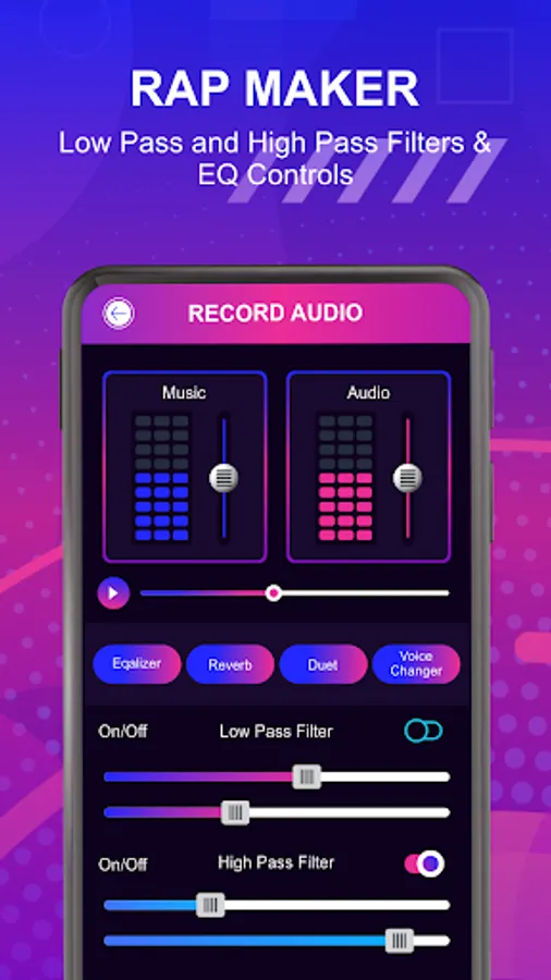 Rap Music Studio with beats contain collection of high-quality beats. You can tune your voice using a powerful auto voice tune. Record your voice, rape it with music beat, and easily share with your friends.