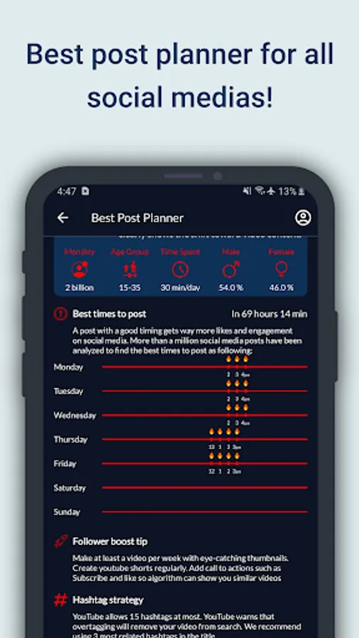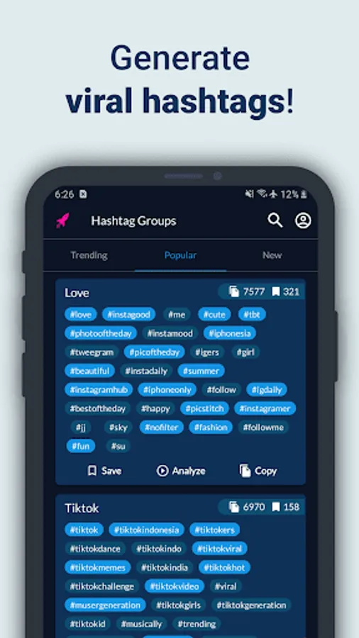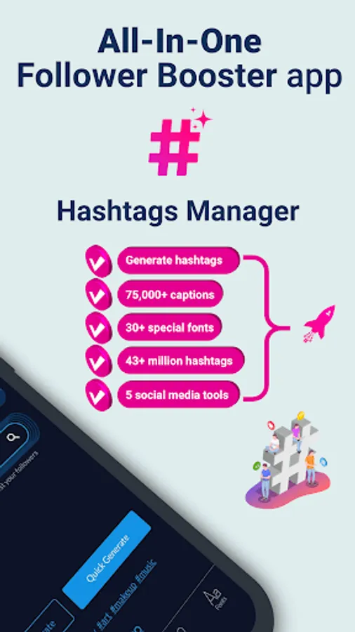 Hashtags AI: Follower Booster is a hashtag generator app for expert users. Our "hashtags manager" and "follower booster" tools can be used for any social media platform like instagram, tiktok, twitter, youtube, linkedin, facebook, pinterest, and snapchat. Only enter your base hashtag then it will generate the viral hashtags from our hashtag database to get more likes and followers. It also has tons of popular hashtags that we chose for all experts. Most of our expert users use the "Hashtag generator" and generate trending hashtags for social media platforms like instagram and tiktok to gain more likes & followers organically.
