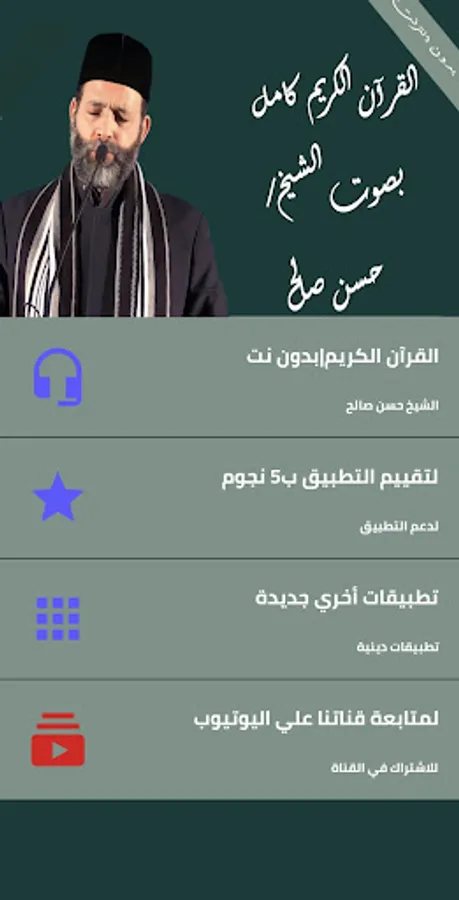 The Holy Qur’an is complete, recited with the voice of Sheikh Hassan Saleh, Hafs on the authority of Asim, the application works completely without the Internet