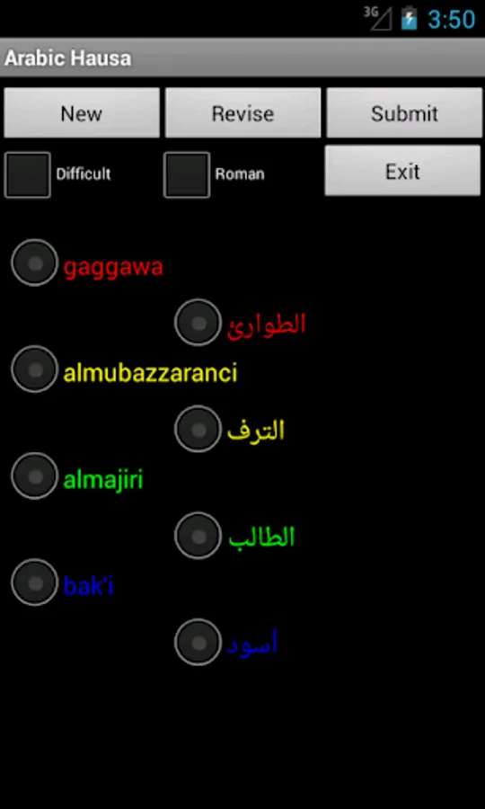 A. Select New, then touch the head word in the left column and it's matching word in the right column. Its colour will change. Repeat this for all words and then select Submit to check the answers