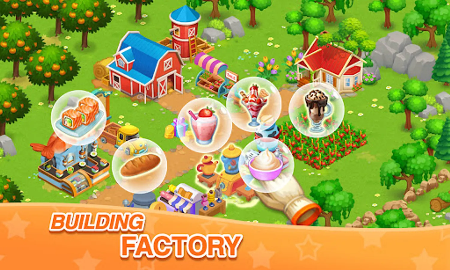 - Use harvested items and put in factories to produce finished products