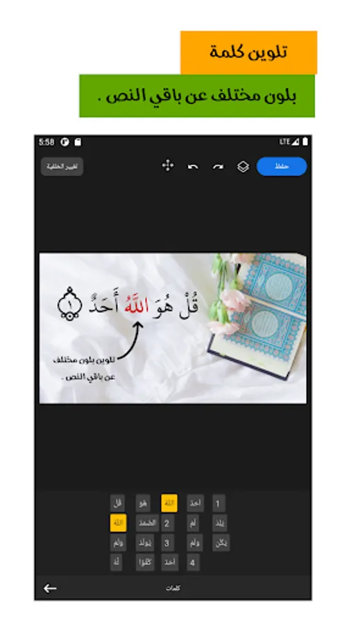 ▪️ تلوين كلمة بلون مختلف عن باقي النص مثال( الله بلون وباقي الأيات بلون )