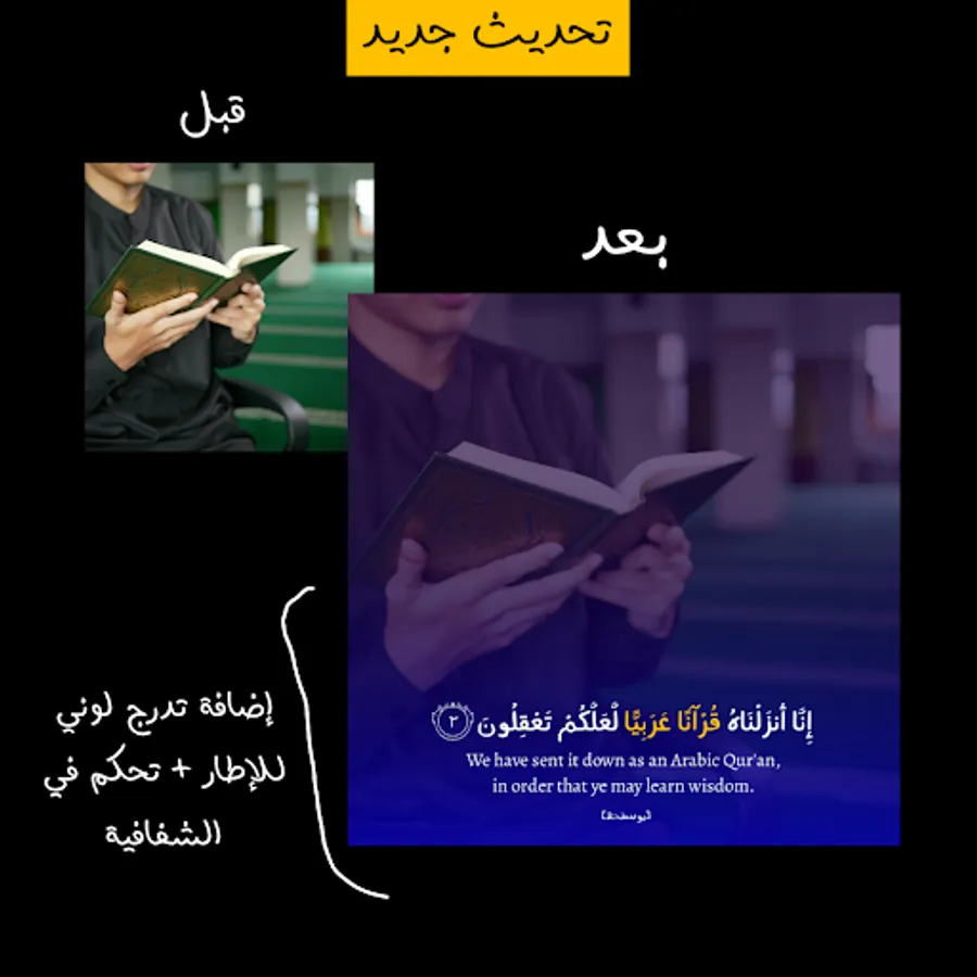 ❤️🩹 المشكلة : لتصميم صور القرأن الكريم يحتاج المصمم العربي إلى تطبقين : الأول لتطبيق آية والثاني لتصميم الصور والكتابه عليها وإذا كان التطبيق أجنبي تحتاج تحميل الخطوط العربية بنفسك وإذا كنت تريد عمل مونتاج فيديوهات للقرأن الكريم ستحتاج لعمل صور بخلفيات شفافة والأن ؟