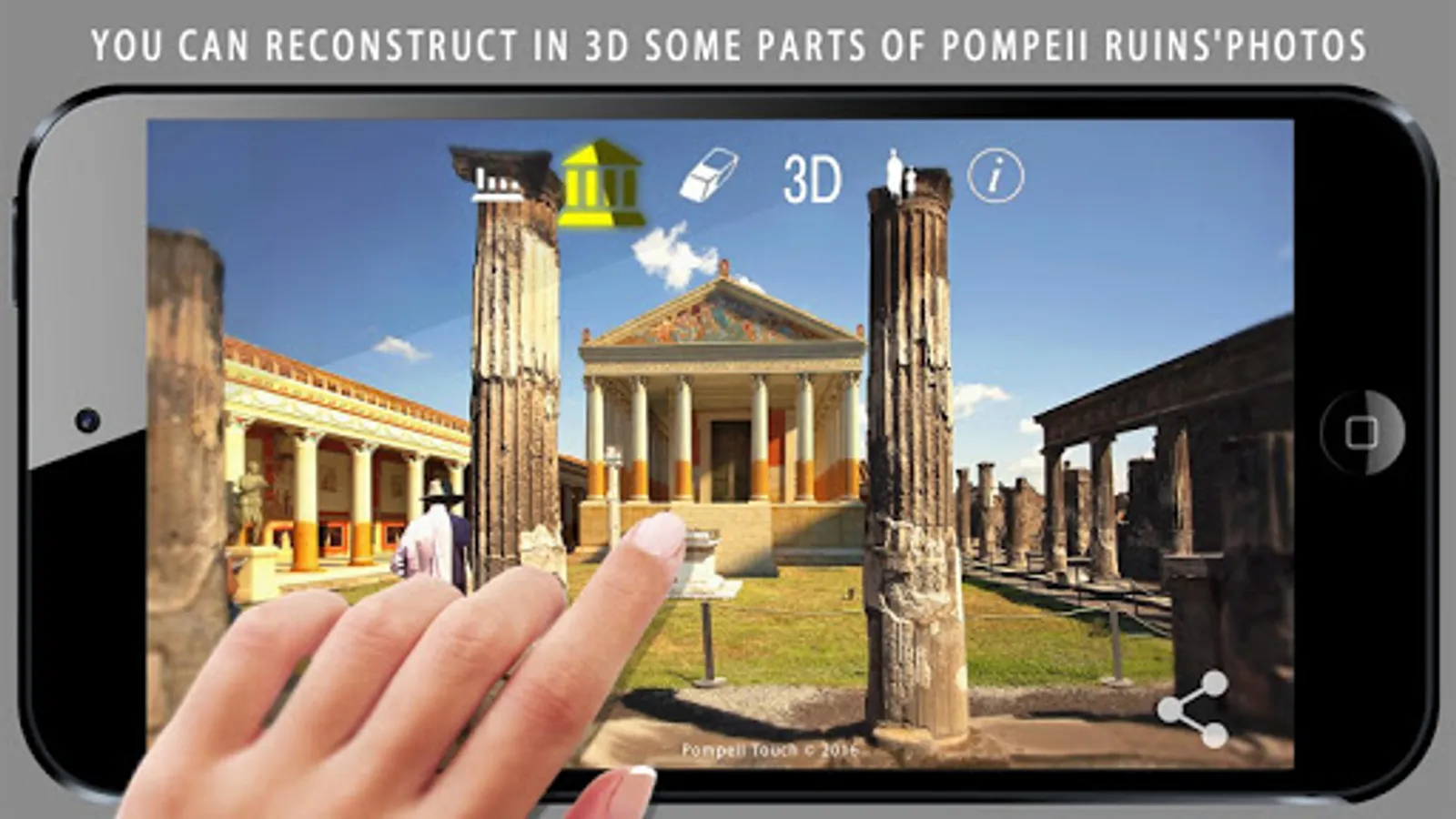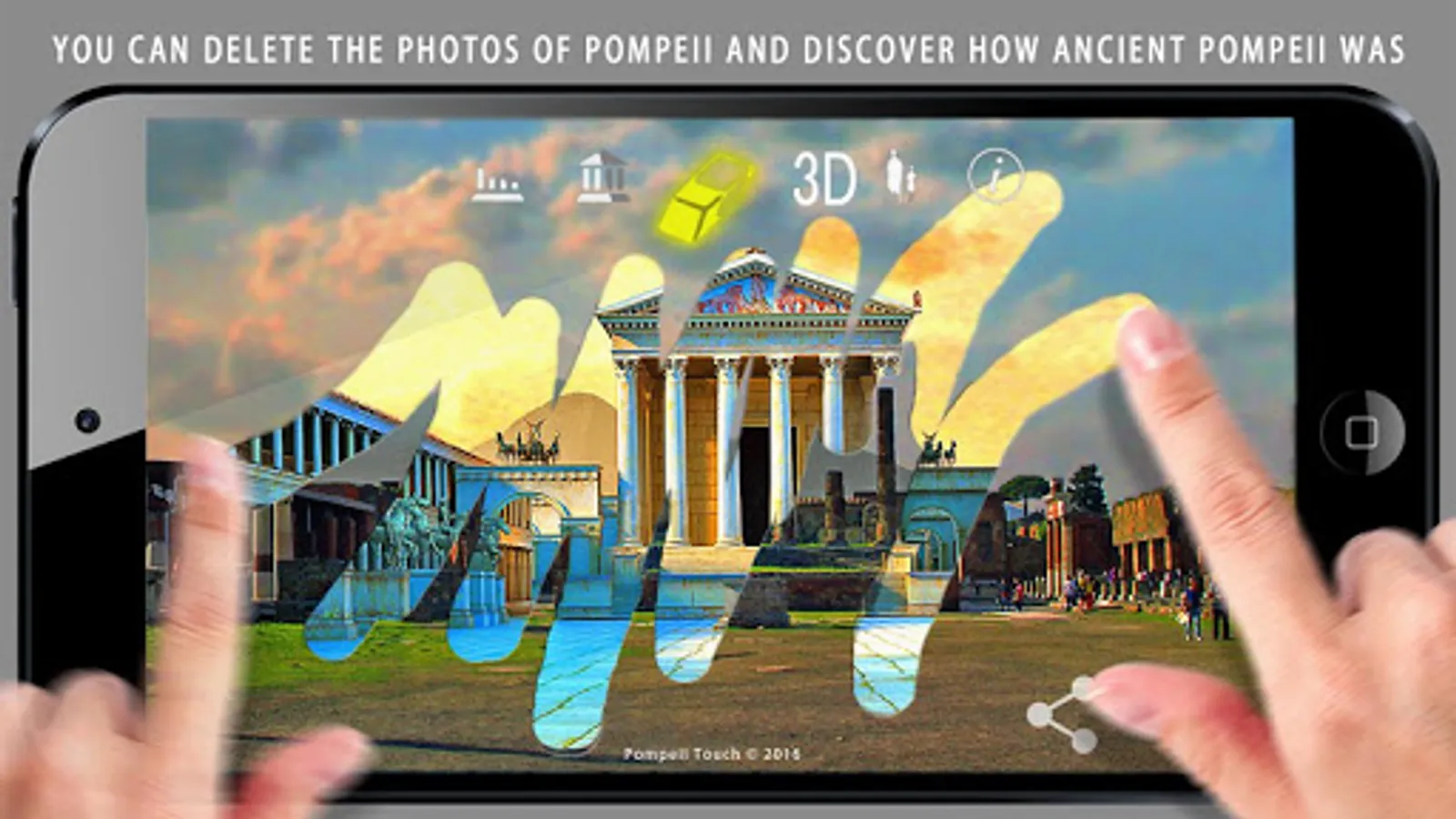 Downloading POMPEII TOUCH app on tablet and smartphone, users can choose a photo of a location and, with a touch, it appears correspondent and reconstructive hypothesis of places.