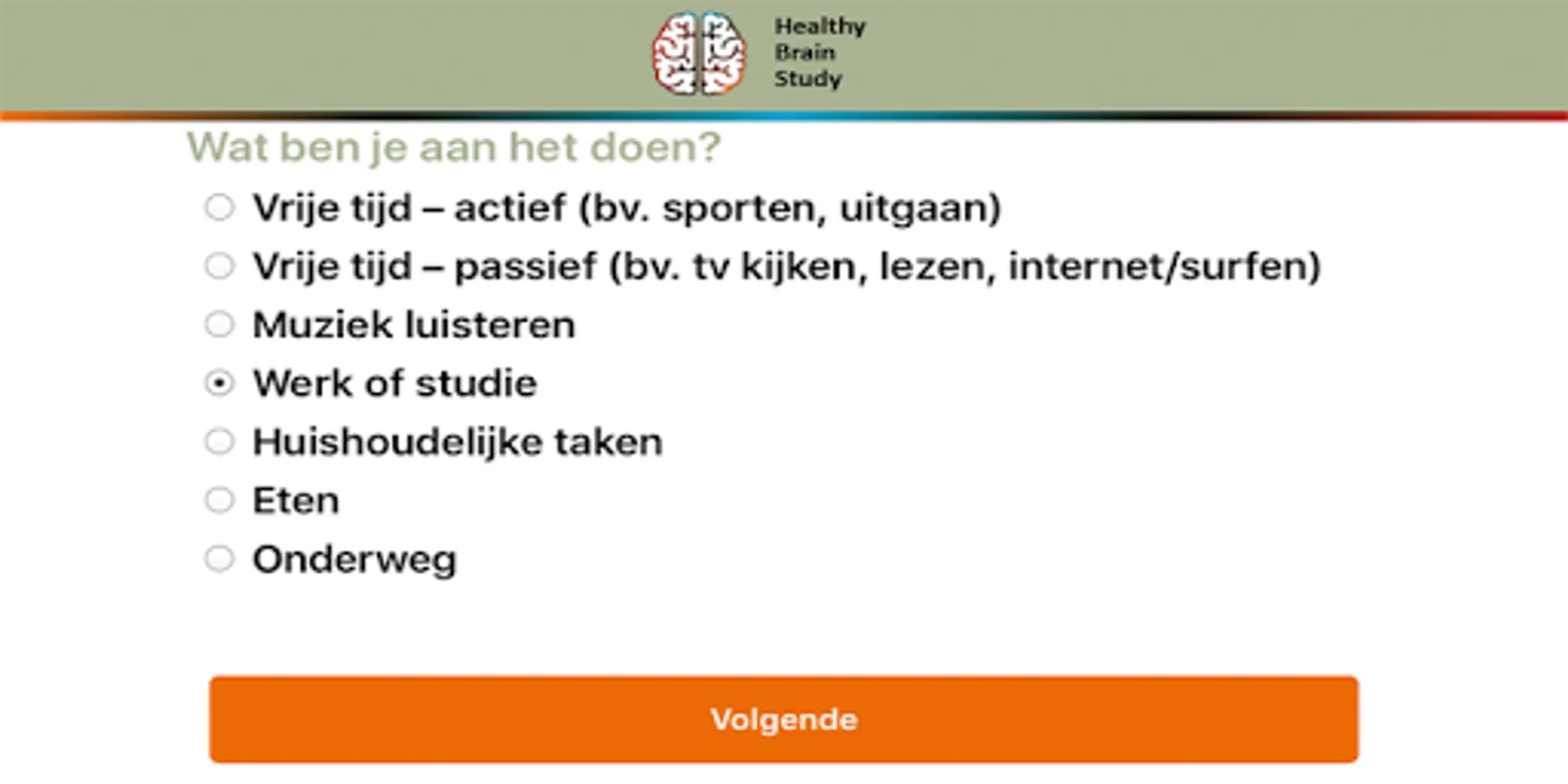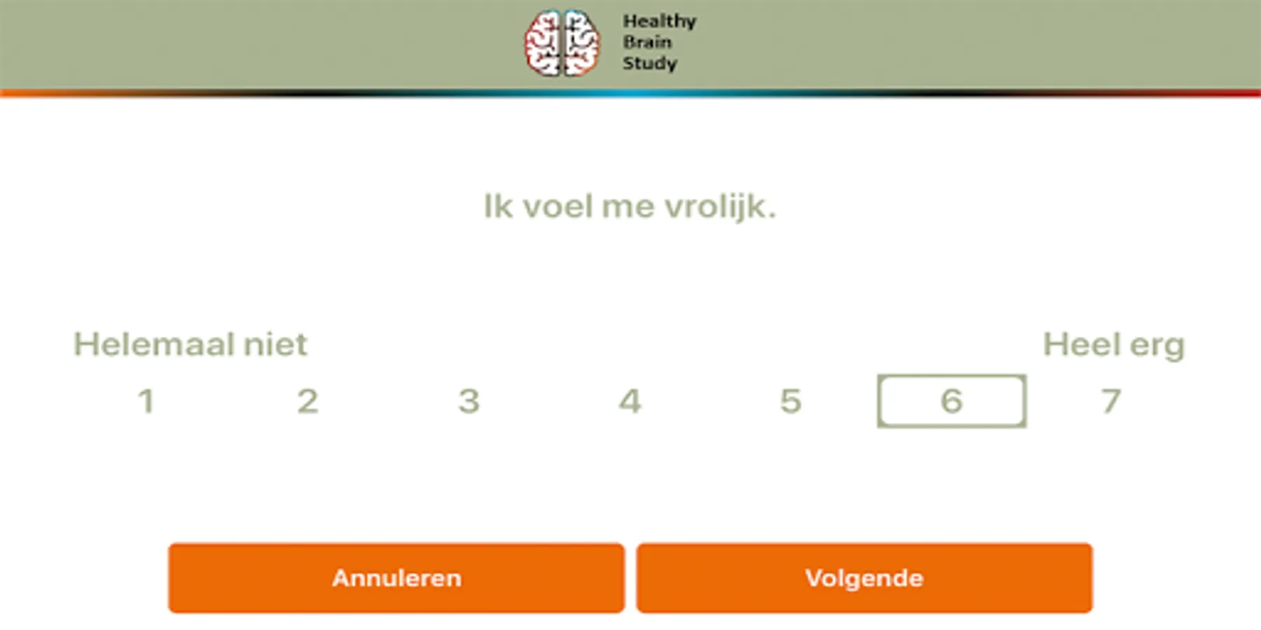 Through this app you as a participant in the Healthy Brain Study get questions about your daily activities. Every day in the week prior to their visit to the Radboud Campus you will receive several notifications per day on your mobile to indicate, among other things: