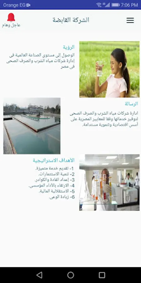 The application becomes personal to the user by recording his personal data with the possibility of modification, in addition to enabling him to solve the company questionnaire to see his opinion on many application uses or issues related to water and sanitation.