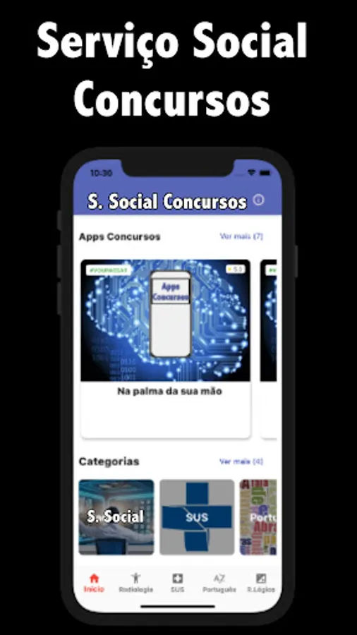 The Social Service Contests App has questions about: Social Service, SUS, Portuguese and Logical Reasoning.