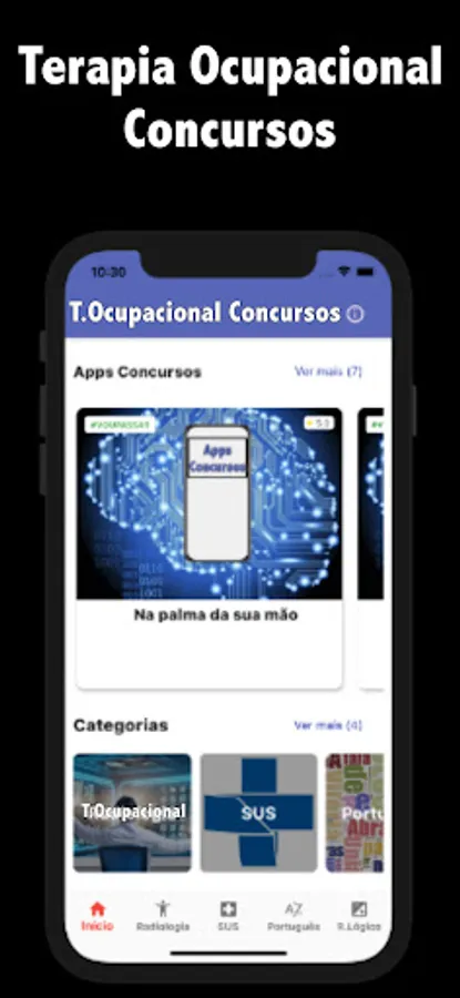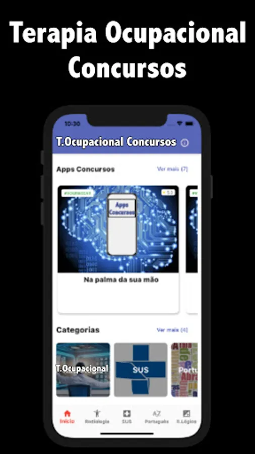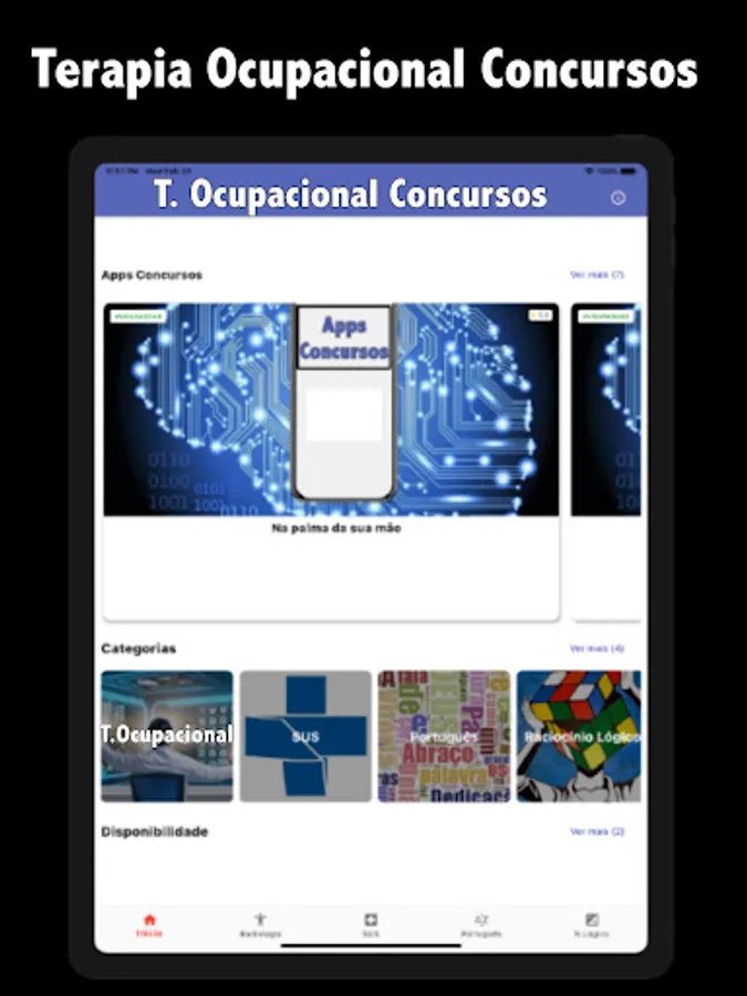 The Occupational Therapy Contests App has questions about: Occupational Therapy, SUS, Portuguese and Logical Reasoning.