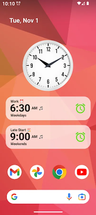 Set or disable alarms from home screen, without opening the app. You can also decorate your home screen with beautiful clock widgets in various styles and watch faces.