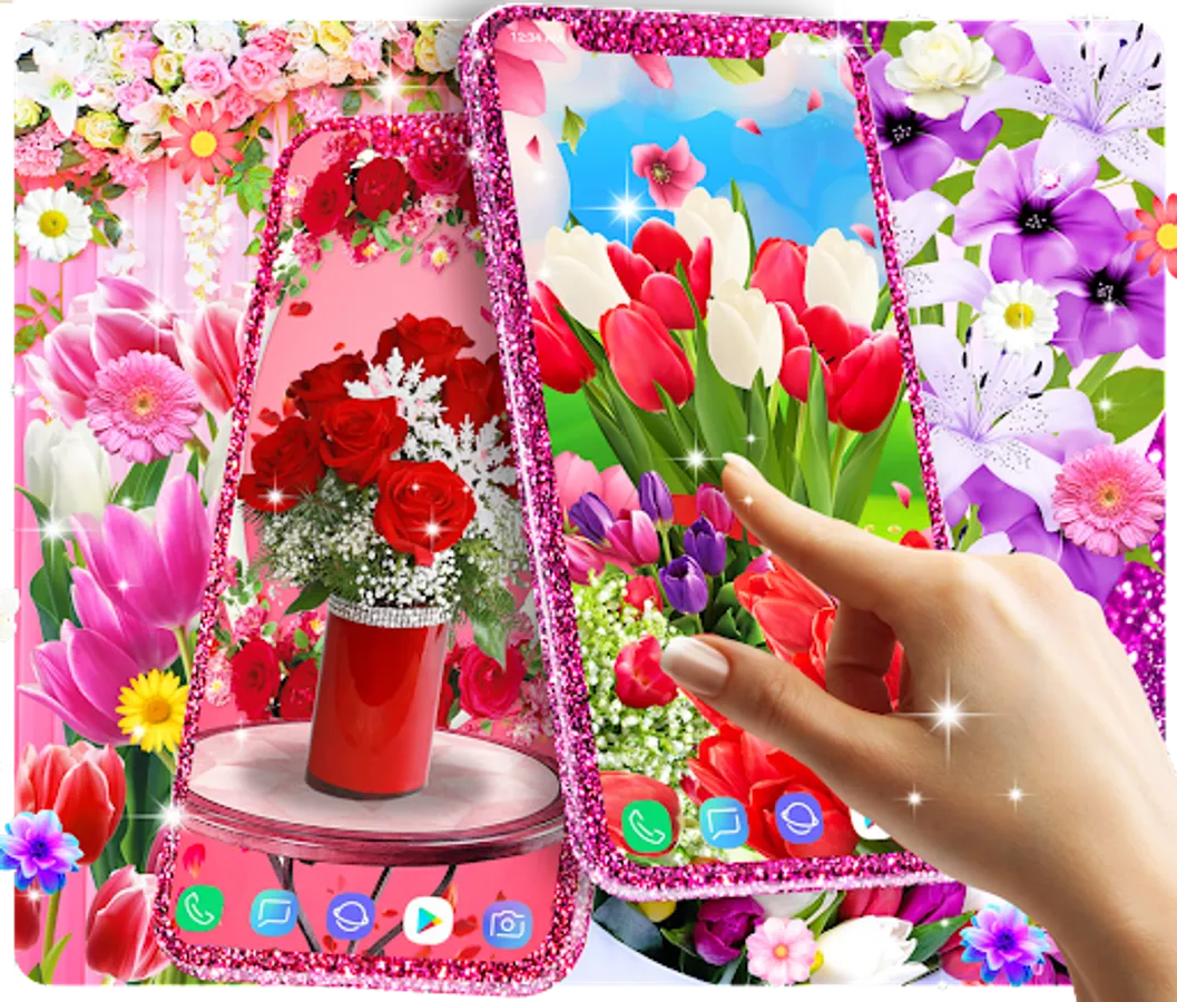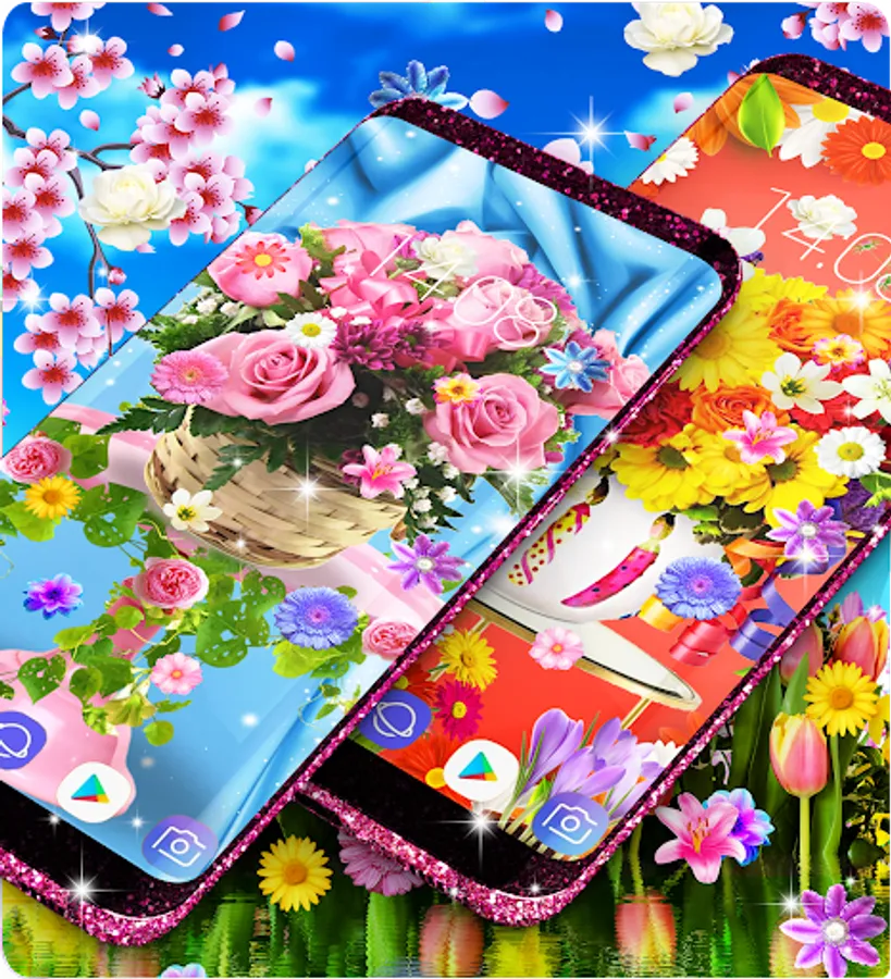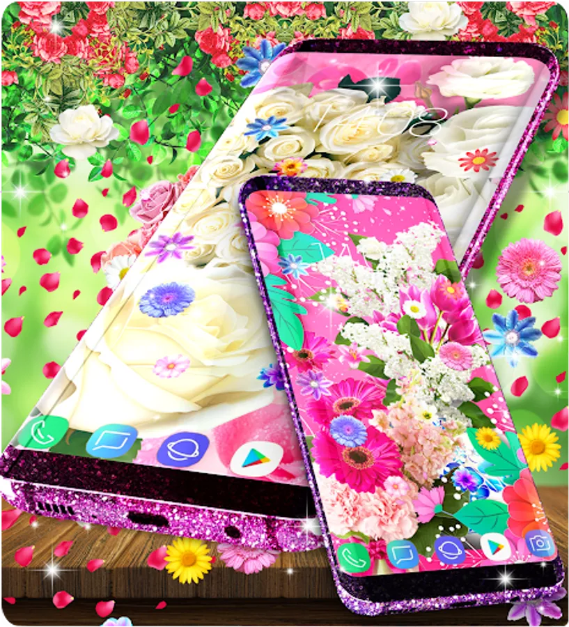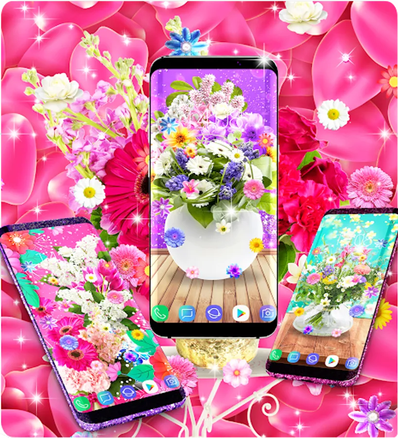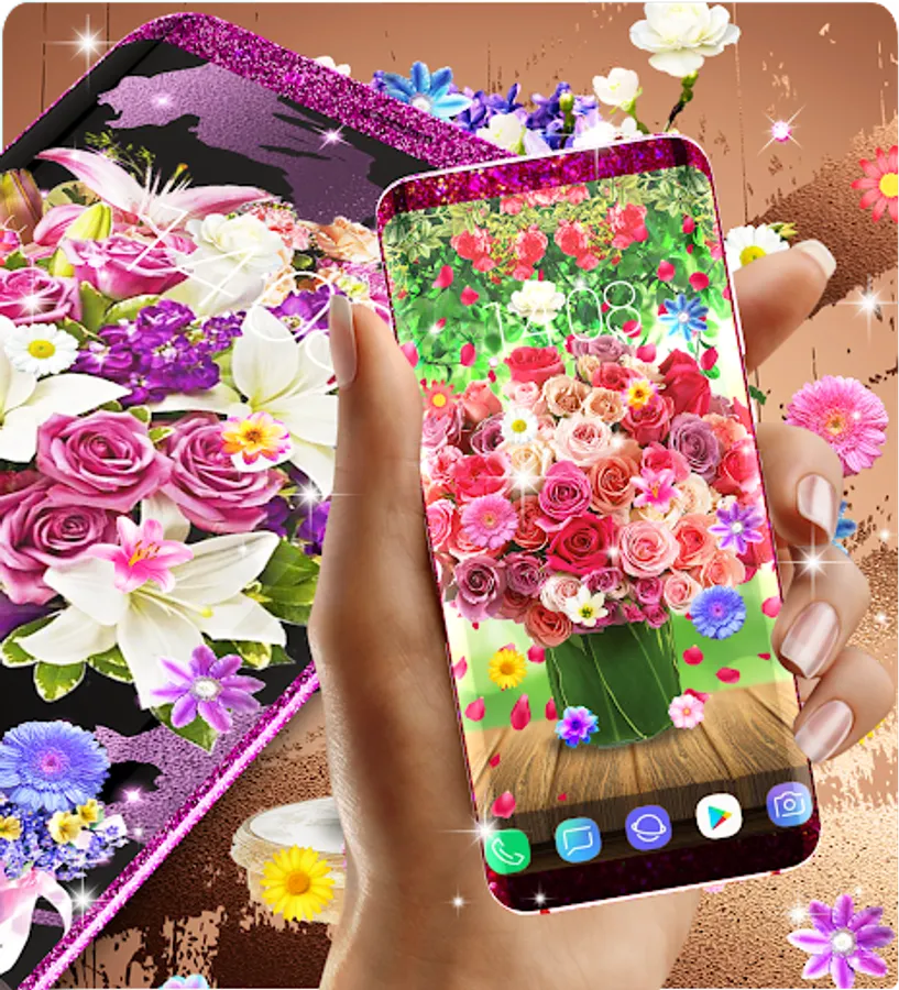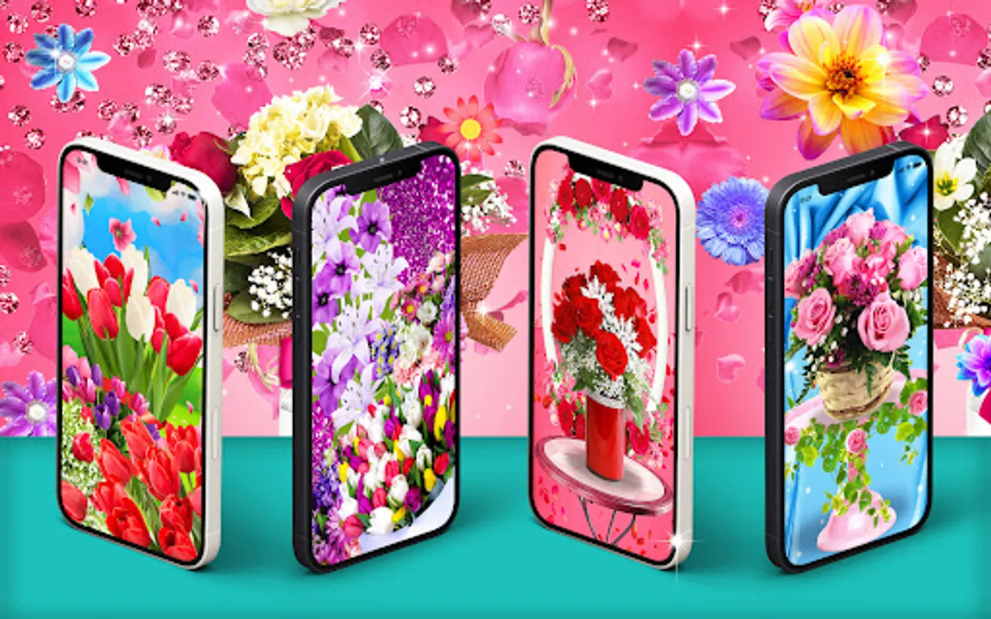 Flowers bouquet live wallpaper is a new beautiful app with various flowers images and live animations. You will find hd images with flowers elements and pink, purple or blue colors. Elements will fall over the screen. Create your own live wallpaper, choose your image and elements and personalize it as you wish, you can choose from those elements: diamonds, white and pink roses, sunflowers, pink lily, margaret, passiflora, summer or spring flowers.