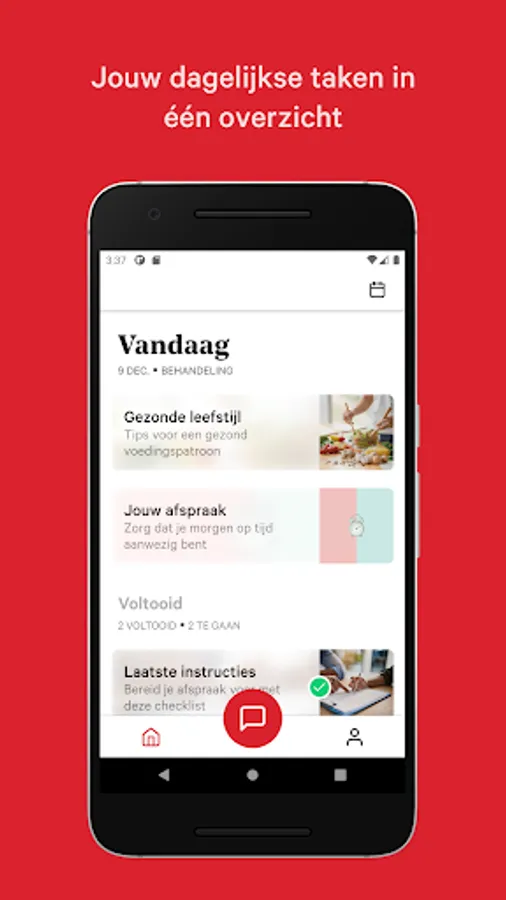 The Boerhaave app is there for you as a digital assistant during your treatment journey. By providing you with information, personally guiding and supporting you, you are always fully informed. We'll give you a heads up whenever there's something you need to do or know about your treatment.