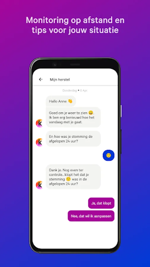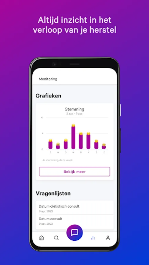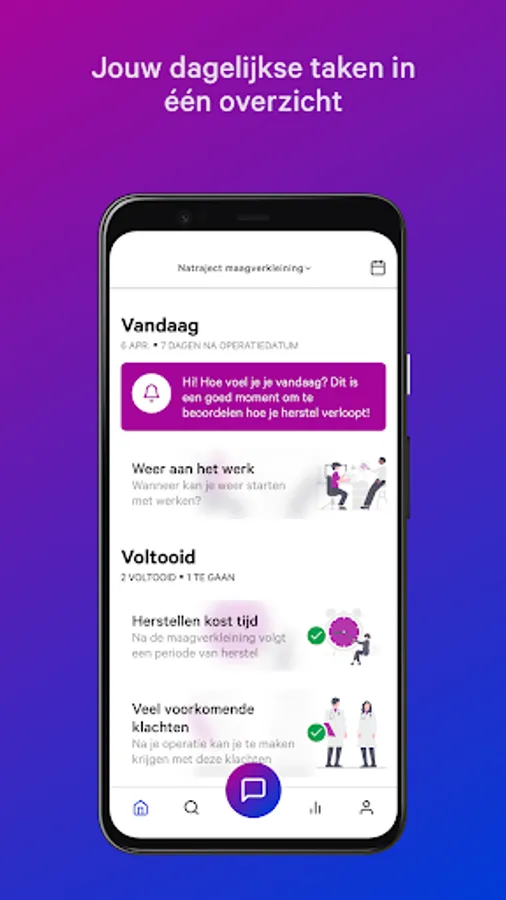Changing your lifestyle in one go is not easy. The Ksyos Bariatrie App helps you to make a lasting change to your lifestyle. For example, you can use it to track your weight and fill in questionnaires. This way, we can see how you're doing and provide extra guidance when needed. You can also find all the important medical information there, such as information on exercise, lifestyle, and how to make permanent changes to your eating habits.