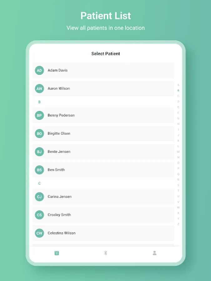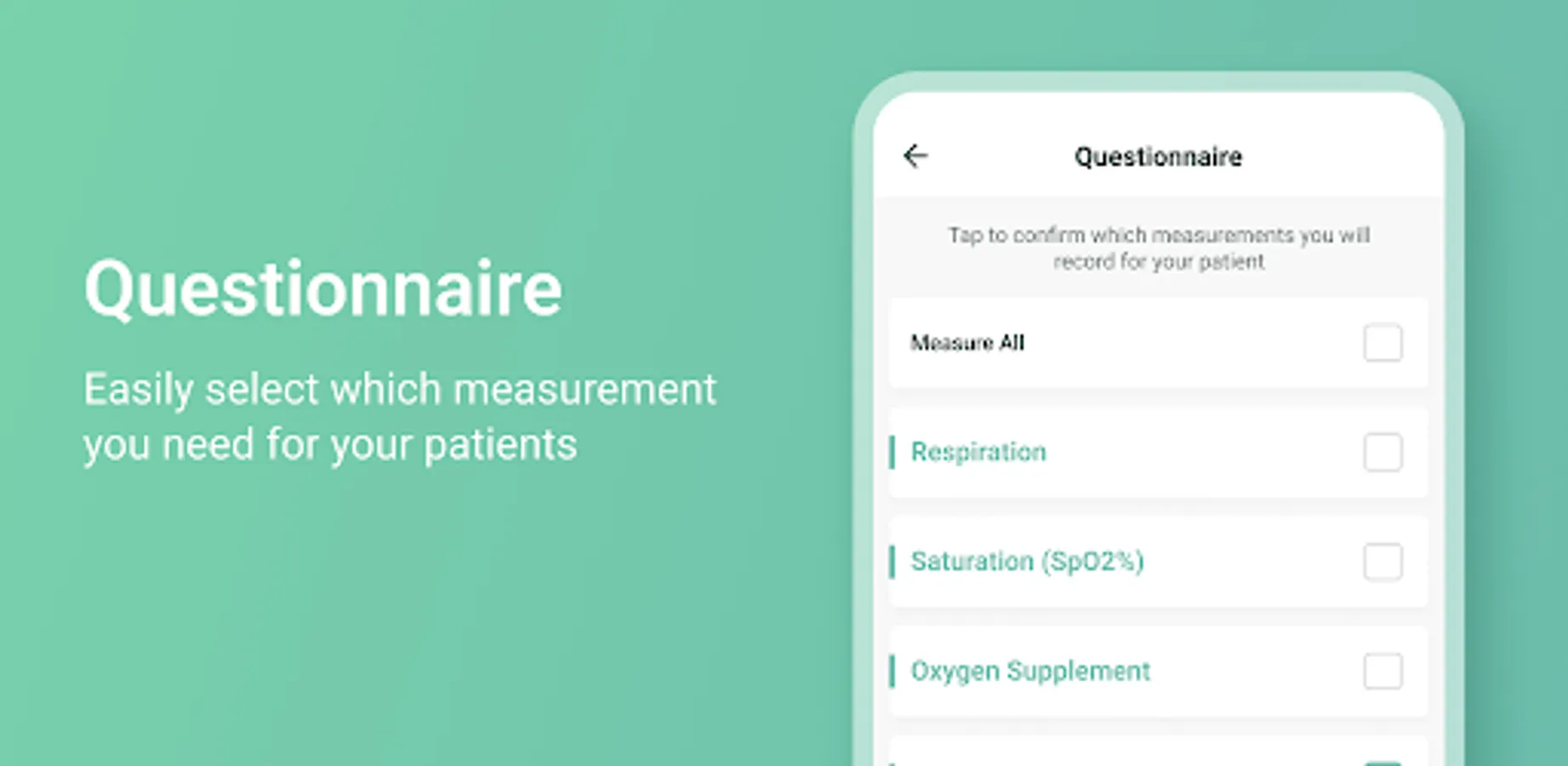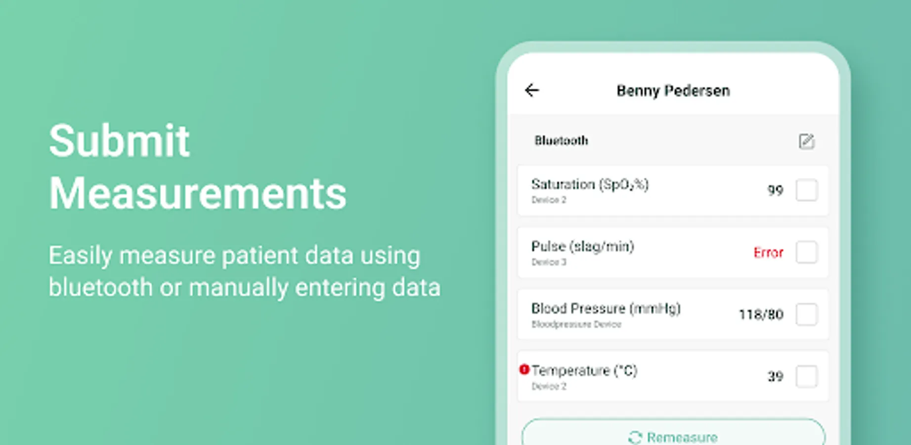 Using the app and BTE IoT medical devices, patients get their symptoms and health data measured and submitted by a health professional, or themselves. The data is submitted by filling in various questionnaires which can be found in the app's "Carry out measurements" section. The submitted data is continuously monitored by the eDoctors, who can thus follow the status of the subacute patients and adjust the treatment as needed.