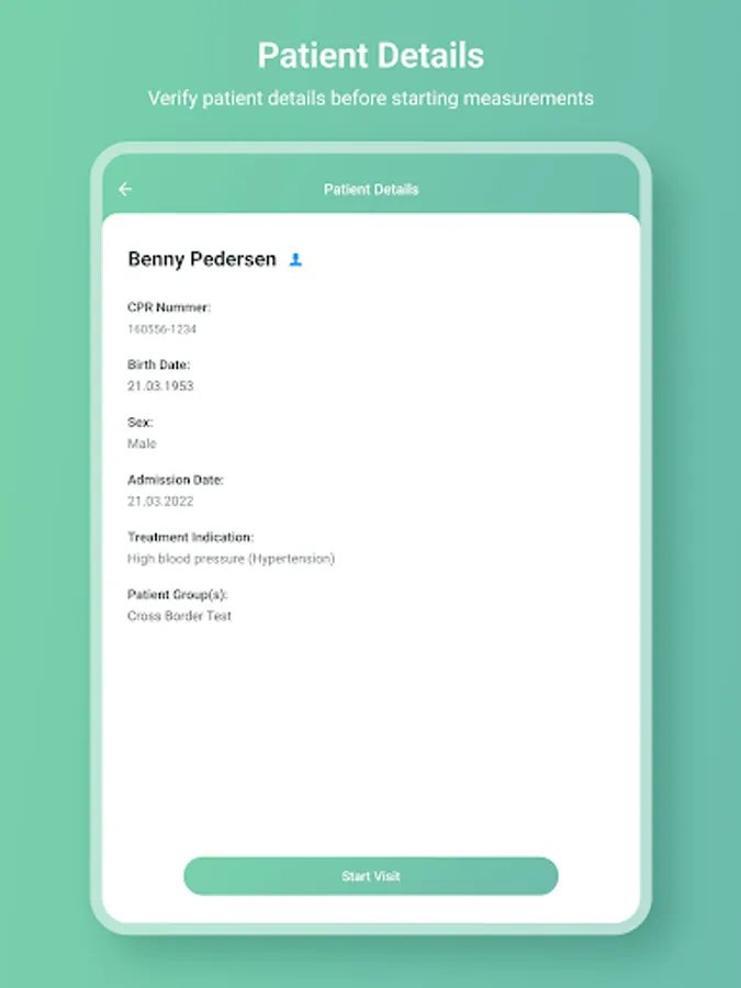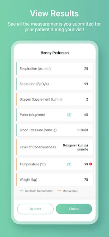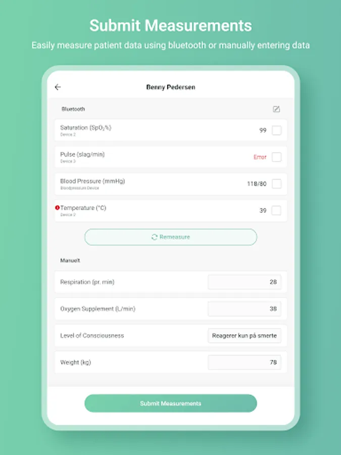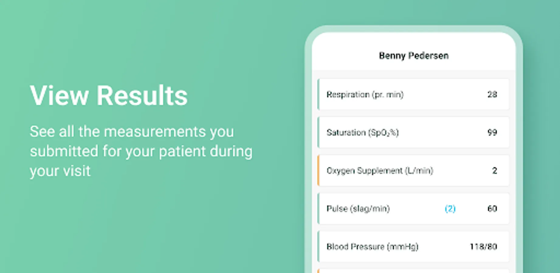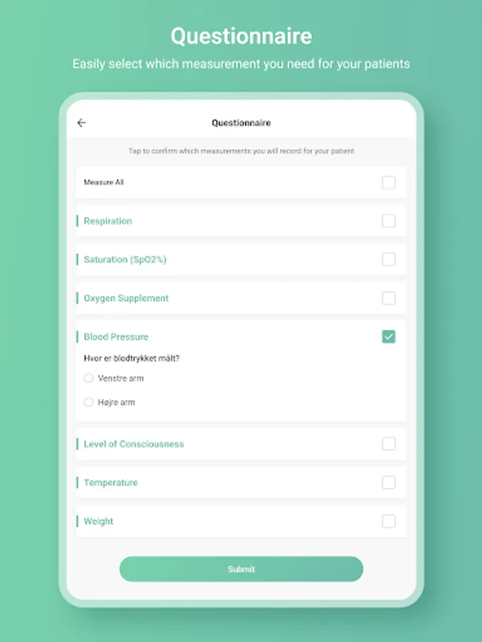 Using the app and the connected IoT BLE enabled medical devices, patients have their symptoms and health measurements measured and submitted by a healthcare professional or by themselves. The data is submitted by completing questionnaires which can be accessed in the apps “Start visit” section. The submitted data is continuously monitored by the eDoctors in the region, who can thus follow the status of the sub-acute patients and adjust the treatment as needed.