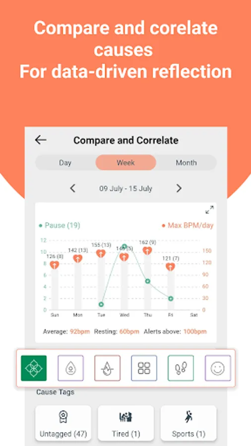- Tag a cause/reason (work, social, physical), add notes and mood-info