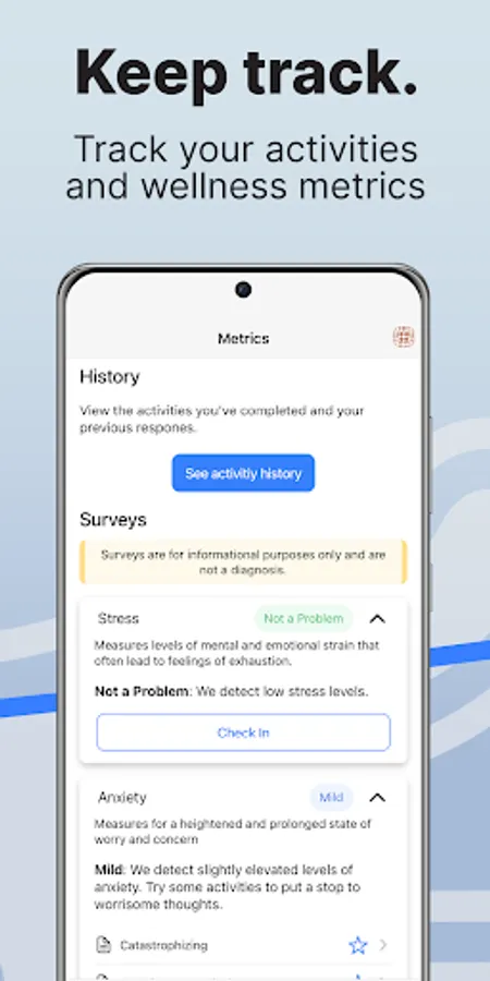 - See your mental wellness progress through your survey results and completed activities.