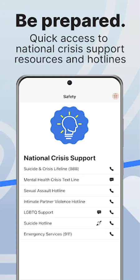 - Access national crisis hotlines.
