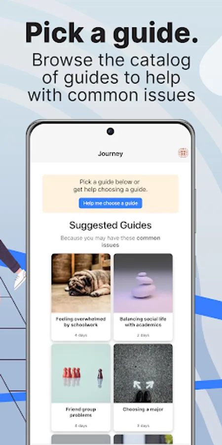 Choose from a library of guides that walk you through problems that college and university students regularly face like procrastination, friend group problems, choosing a major, and many more. Follow the steps of the guide to learn and practice evidence-based therapeutic skills like recognizing negative thought patterns, relaxing with mindfulness meditation audios, improving your distress tolerance, and more.