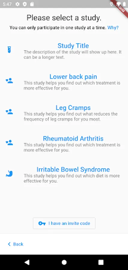 The StudyU Health app is part of the StudyU platform, together with the StudyU designer. With the StudyU designer, scientists are given a web application to digitally specify, publish, and conduct N-of-1 trials. The StudyU app is a smartphone application with innovative user-centric elements for participants to partake in the published trials and assess the effects of different interventions on their health. Thereby, the StudyU platform allows clinicians and researchers worldwide to easily design and conduct digital N-of-1 trials in a safe manner. StudyU has the potential to change the landscape of personalized treatments both for patients and healthy individuals, as a free collaborative tool for researchers, and as a tool that can be integrated in clinical practice.