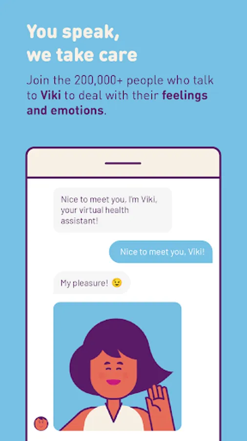 Viki, our robot, will talk to you daily and help you understand how to deal with mental health issues by improving your self-knowledge, cultivating healthy relationships and more.