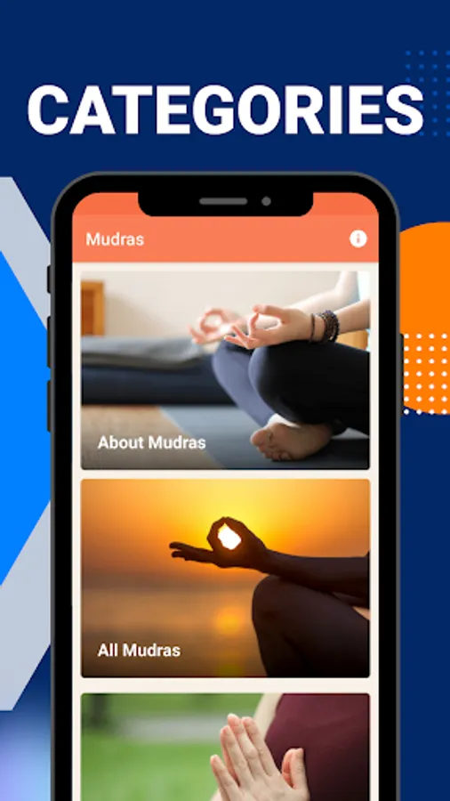 The Mudras (Yoga)๐ง application offers access to over 50 yoga mudras, with step-by-step hand gesture instructions accompanied by photos to make it easy to understand. The mudras are categorized by body parts and benefits, making it easier to target specific areas or achieve complete rejuvenation from diseases. The Mudras app is designed to help you: