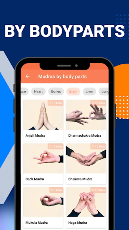 ๐ The Mudras (Yoga) application also offers mudras categorized by body parts, including stomach, nerves, throat, kidneys, ears, eyes, lips, nose, heart, bones, brain, liver, lungs, tooth, and thyroid gland. With the Mudras app, you can easily select the right mudra to target specific body parts and improve the flow of energy throughout your body.