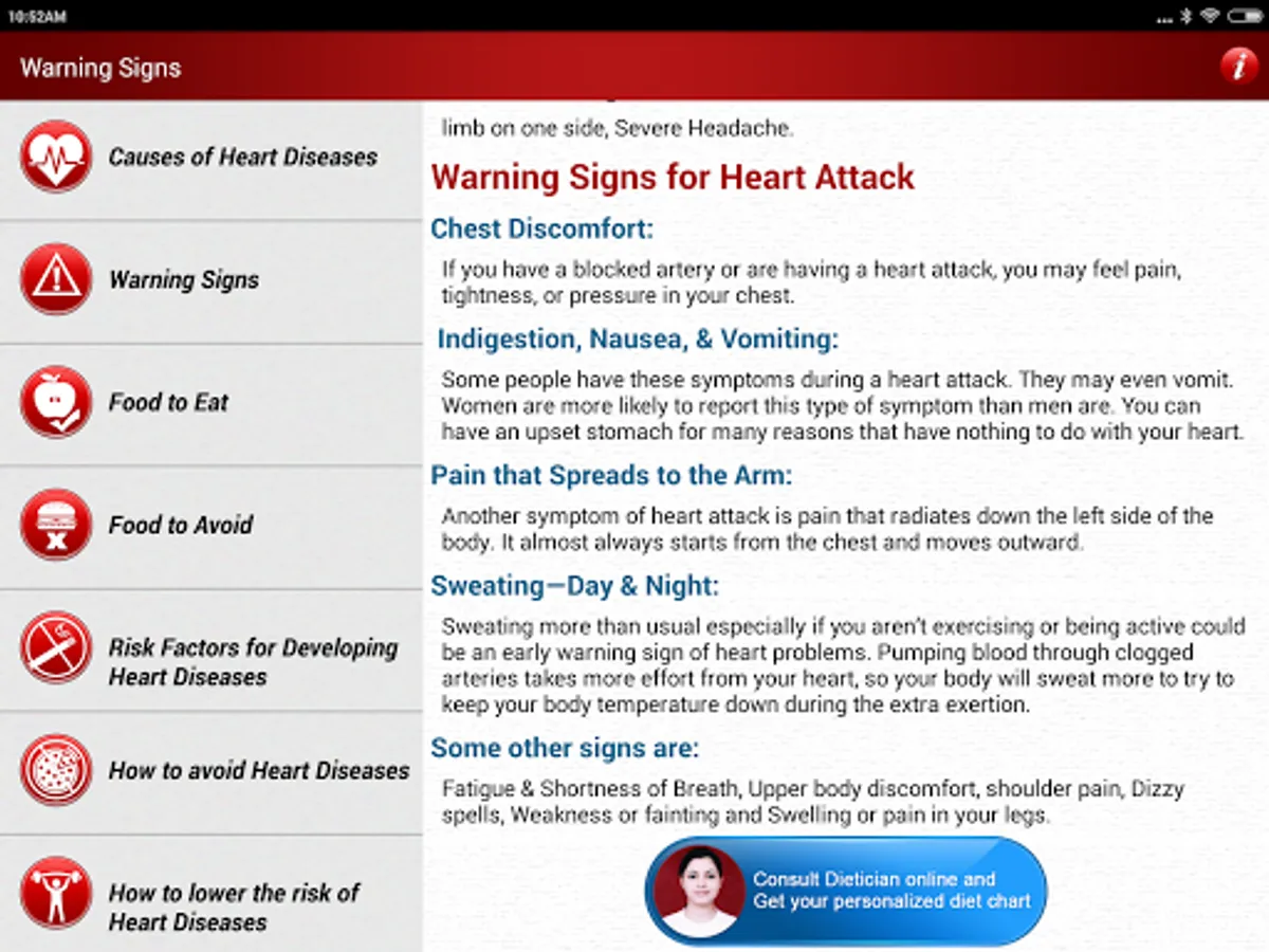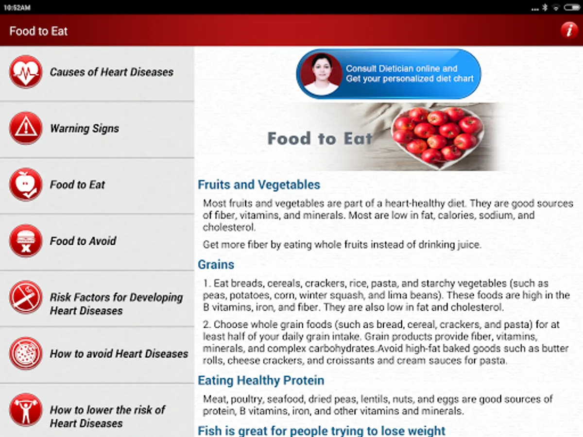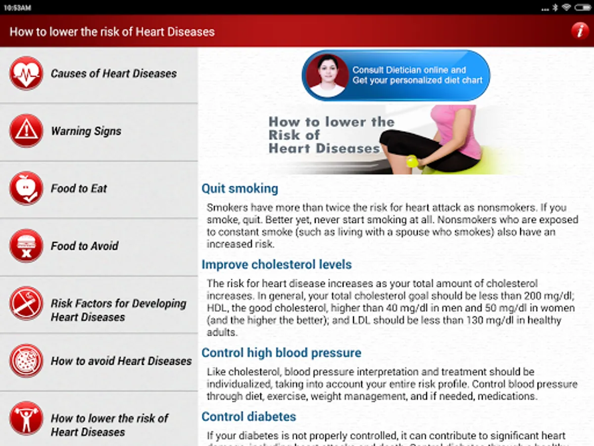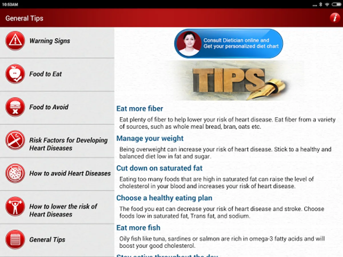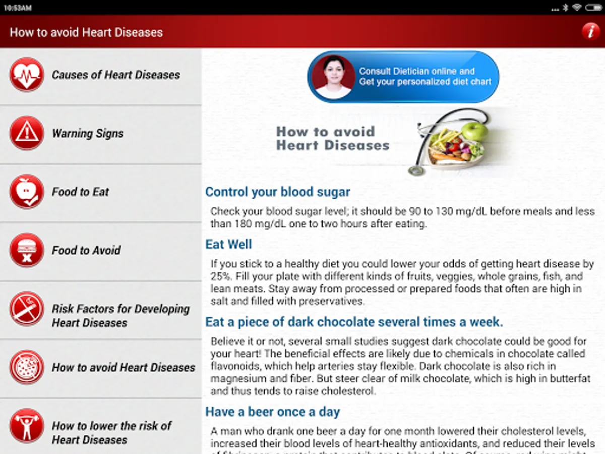 Heart Care Health & Diet Tips is a Free App with Information on Tips Risks Dieting & Nutrition ideas for better health of heart to avoid stroke cardiac attack and other heart diseases for heart patients and well as healthy male and female. If you require additional assistance from real professional dietitians, app allows you to contact the dietician from the App to consult your queries and problems online. You can even seek for your personalized diet chart from the dietitian by using the options from the App.