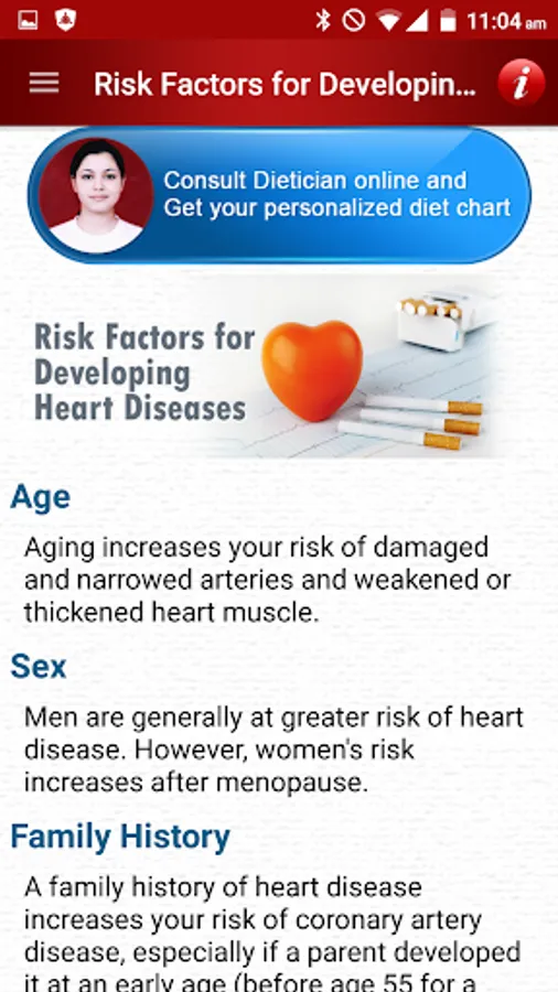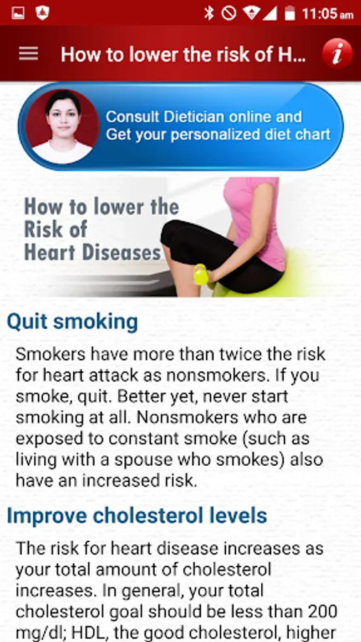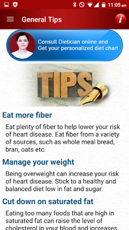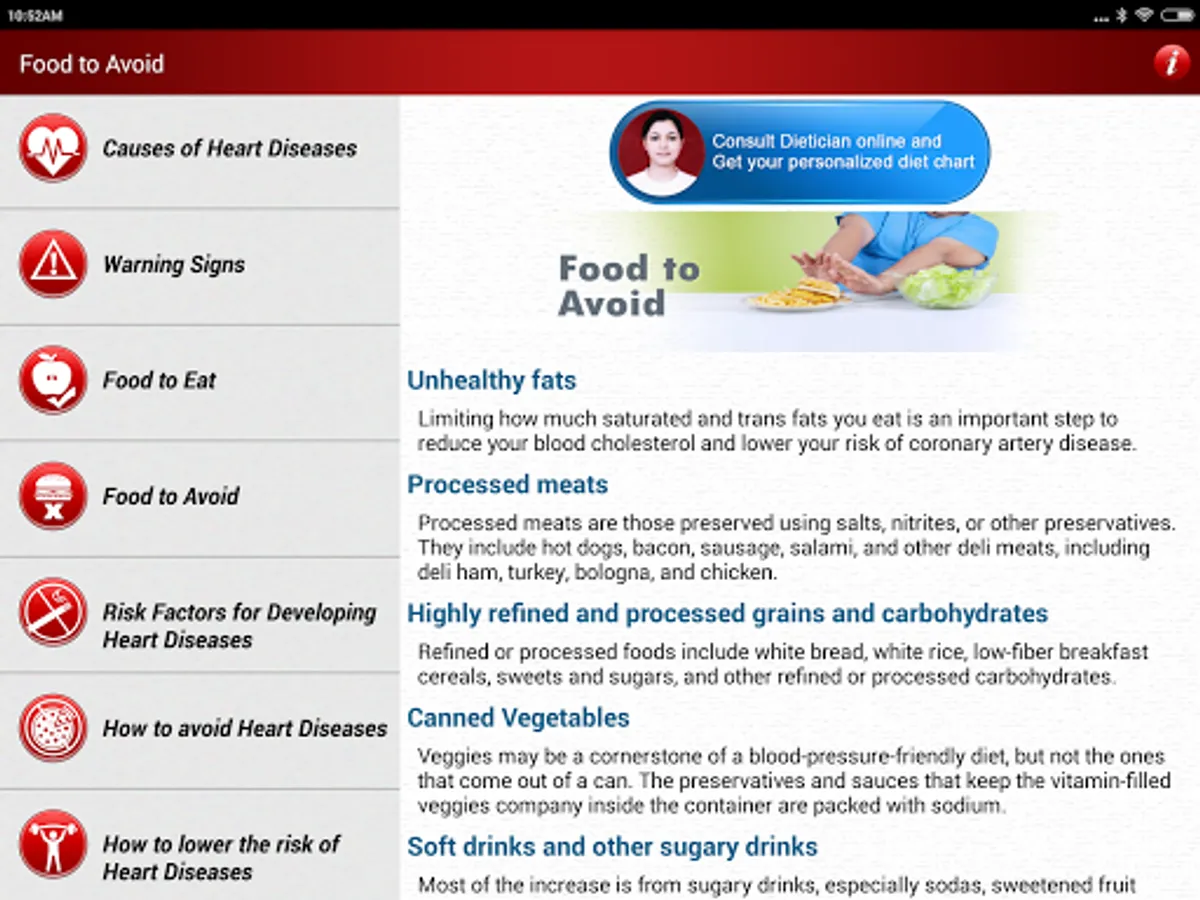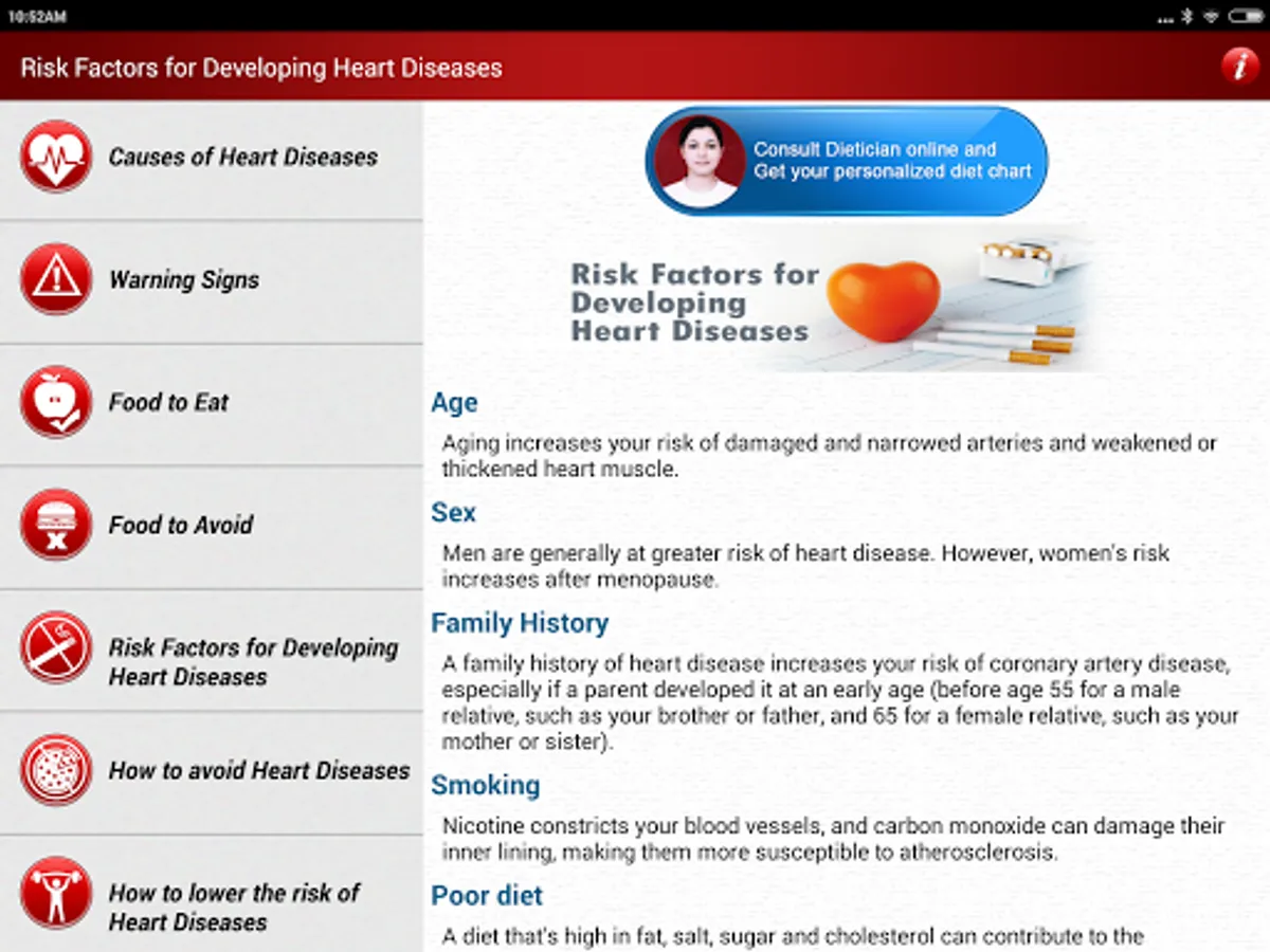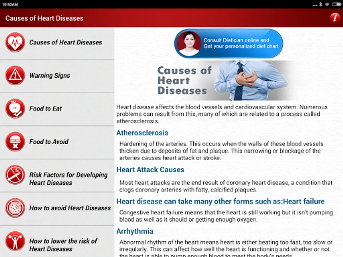 Heart Care Health & Diet Tips is a Free App with Information on Tips Risks Dieting & Nutrition ideas for better health of heart to avoid stroke cardiac attack and other heart diseases for heart patients and well as healthy male and female. If you require additional assistance from real professional dietitians, app allows you to contact the dietician from the App to consult your queries and problems online. You can even seek for your personalized diet chart from the dietitian by using the options from the App.