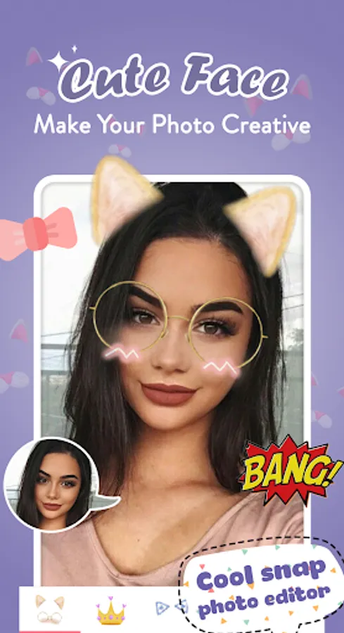 Crown Editor - Filters for Pictures can bring to you the best chance to look cute girl by hundreds of kawaii filters, cat face, dog face camera, camera effect, flower crown, heart crown, cat stickers...This is also an all-powerful Crown Editor that can help you beautify your pics in various ways by 200+ Amazing Sticker Arts and heart filters for pictures. Crown heart sticker photo app are easily adding: Just take a photo or choose from your Library, then pick a favorite heart crown, flowers crown, cat sticker, dog sticker then put them into ur pics. So simple isnβt it!